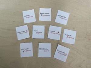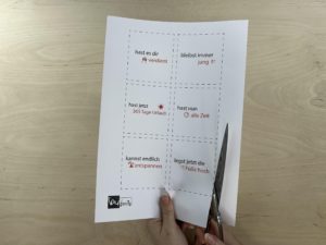 Nun schneidest du die einzelnen „Sprüche“ aus. Ich empfehle dir, diese innen am Rand auszuschneiden, so hast du die Umrandungslinie direkt weggeschnitten.