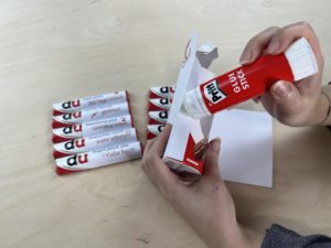 Danach nimmst du einen Duplo-Riegel legst die Vorlage so auf den Duplo-Schriftzug, dass das „du“ noch zu sehen ist. Dann umwickelst du den Riegel mit der Vorlage und befestigst diese mit einem Klebestift.