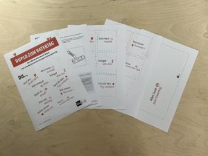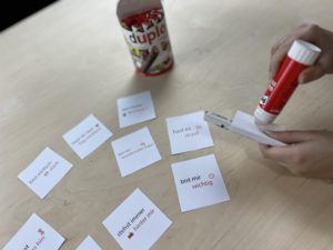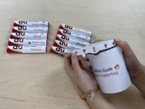 Danach nimmst du einen Duplo-Riegel legst die Vorlage so auf den Duplo-Schriftzug, dass nur noch das „du“ zu sehen ist. Dann umwickelst du den Riegel mit der Vorlage und befestigst diese mit einem Klebestift oder Klebeband .