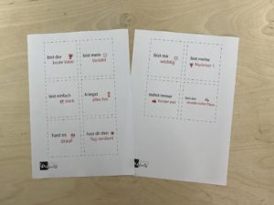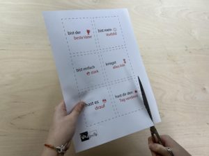 Nun schneidest du die einzelnen „Sprüche“ aus. Ich empfehle dir, diese innen am Rand auszuschneiden, so hast du die Umrandungslinie direkt mit weggeschnitten.