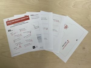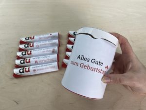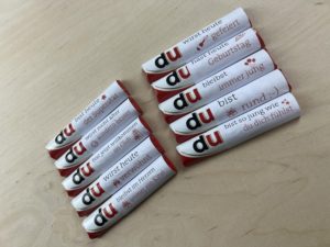 Danach nimmst du einen Duplo-Riegel legst die Vorlage so auf den Duplo-Schriftzug, dass das „du“ noch zu sehen ist. Dann umwickelst du den Riegel mit der Vorlage und befestigst diese mit einem Klebestift.