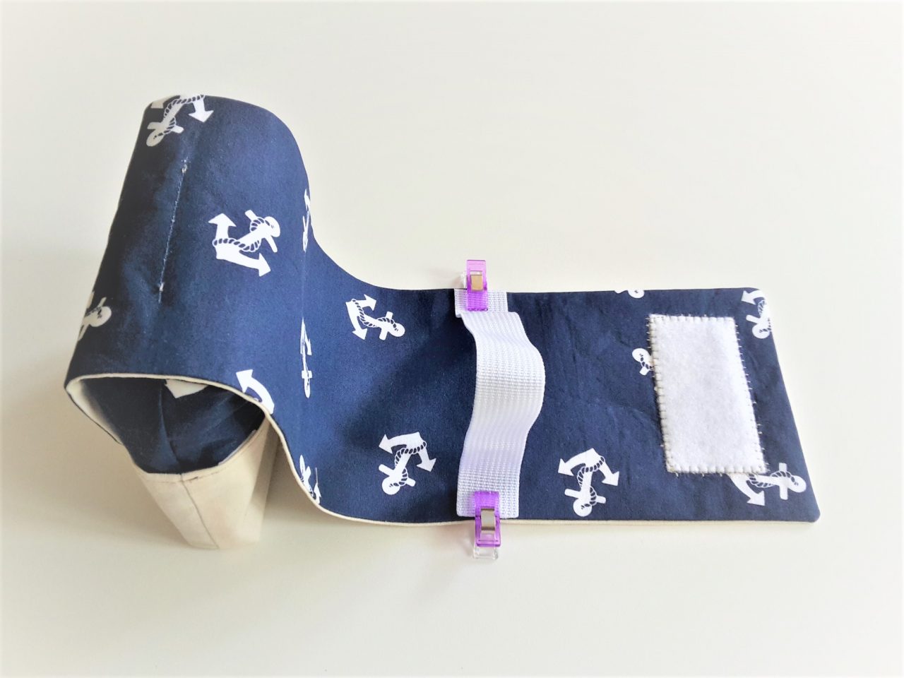 Jetzt die Halterung auf die Innenseite der Taschen Grundkörper platzieren (Bild 8) und von innen der Halterung an den Taschengrundkörper festnähen (Bild 9). Nun die untere Taschenkante unter den Umschlag der Halterung stecken und festnähen (Bild 10).