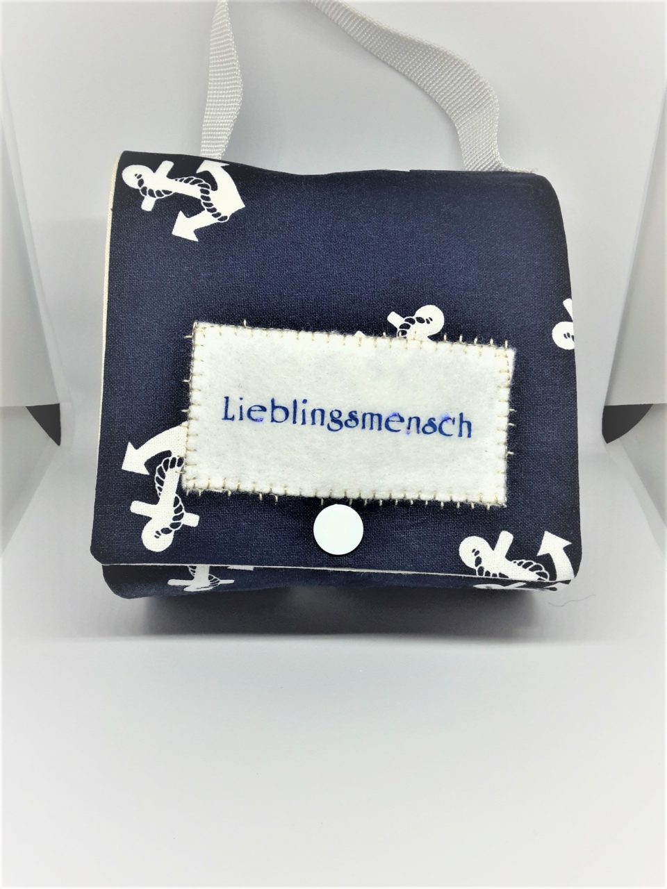 Zum Schluss nur noch das Gurtband für den Tragegriff annähen, hierbei das Gurtband an der Taschenkante bündig anlegen und ein kleines Quadrat nähen. (Bild 11). Druckknopf anbringen und wer mag, kann an den Taschendeckel noch ein Name usw. aufplottern (Bild 12).