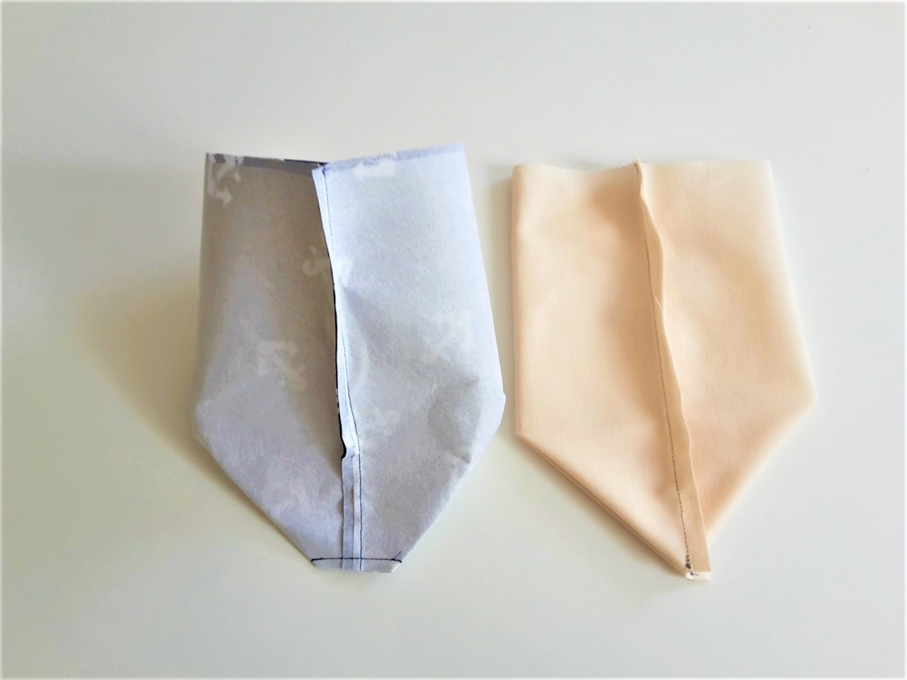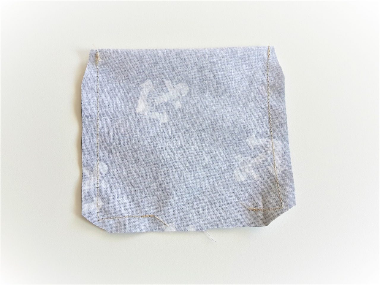 Damit die Halterung Stand hat, werde jetzt an der Bodenkante jede Ecke aufeinandergelegt und von der Spitze ab 2,5cm waagrecht abgesteppt und die Nahtzugabe gekürzt. (Bild 6).