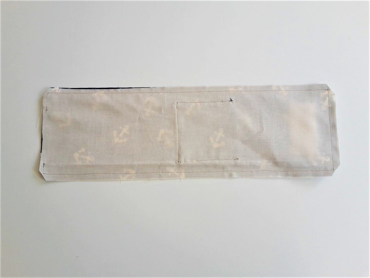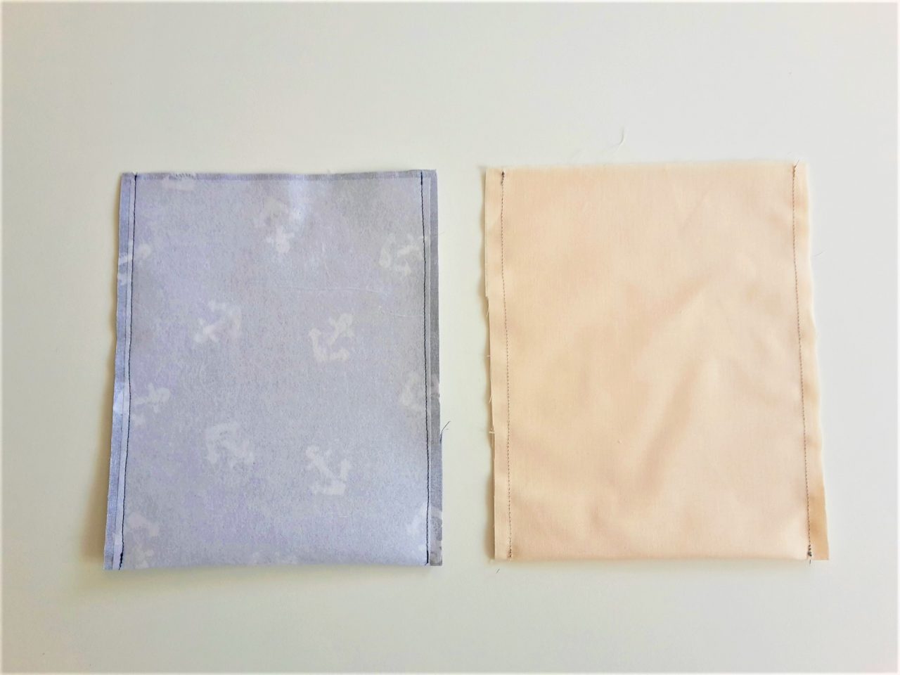 Falte beide Stoffzuschnitt (Außen- und Innenstoff) der Tassen-Halterung einmal zur Hälfte, dabei liegen die rechten Stoffseiten aufeinander. Steppe an jeder langen Kante Füßchen breit ab (Bild 5).