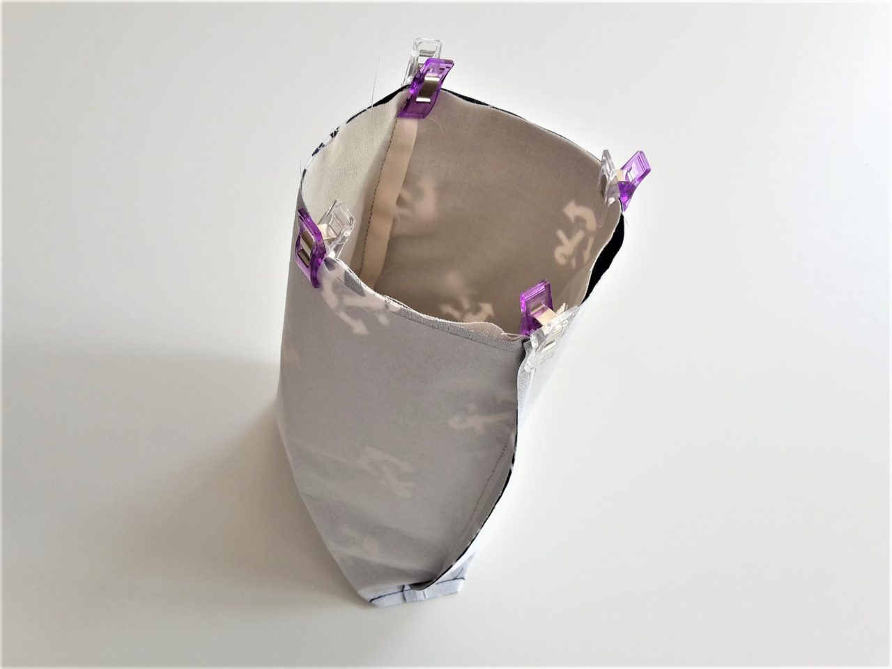 Nun der Außenstoff rechts auf rechts auf den Innenstoff des Taschen Grundkörper legen und Steppe einmal ringsherum an allen Kanten ab, lasse dabei eine Wendeöffnung an der unteren kurzen Kante frei. An den Ecken die Nahtzugabe etwas kürzen. Durch die Wendeöffnung stülpen, alle Ecken gut ausformen und einmal glattbügeln. (Bild 4).