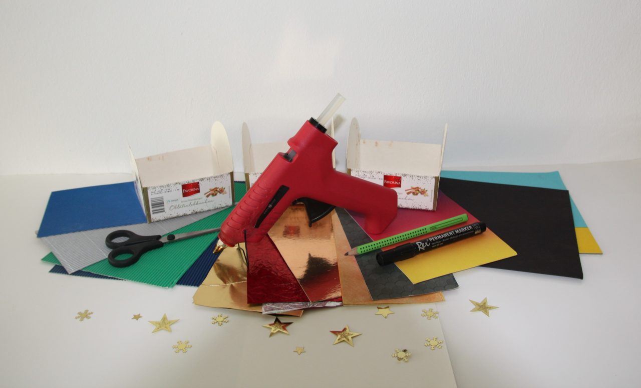 - verschieden gemusterte Papiere und Pappen zum Dekorieren