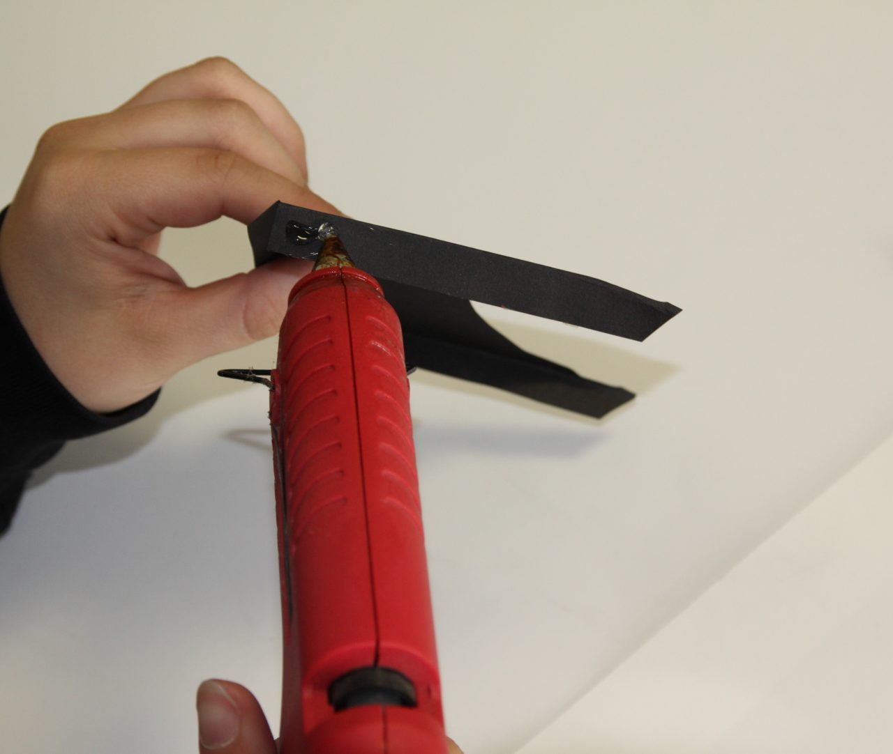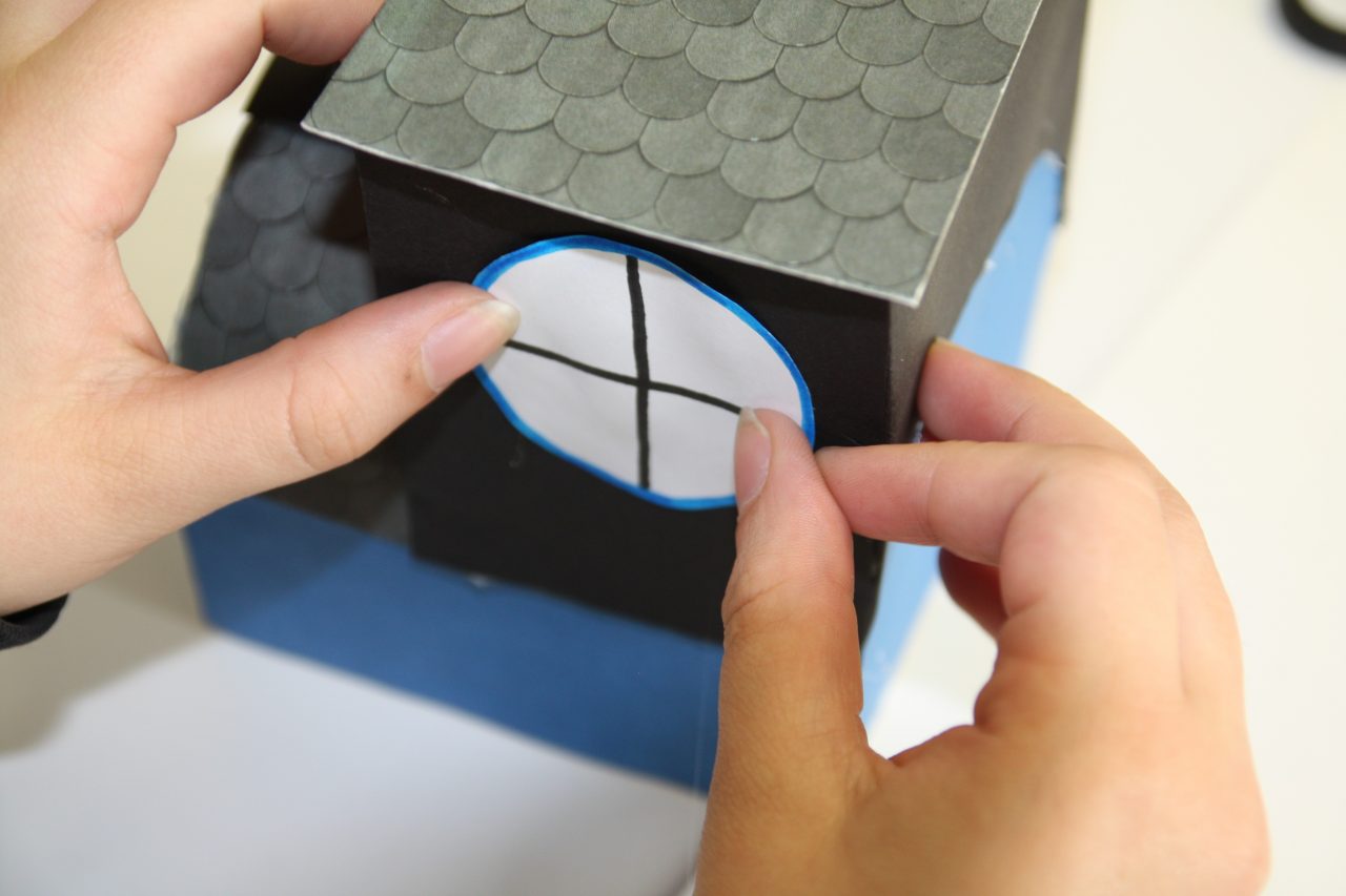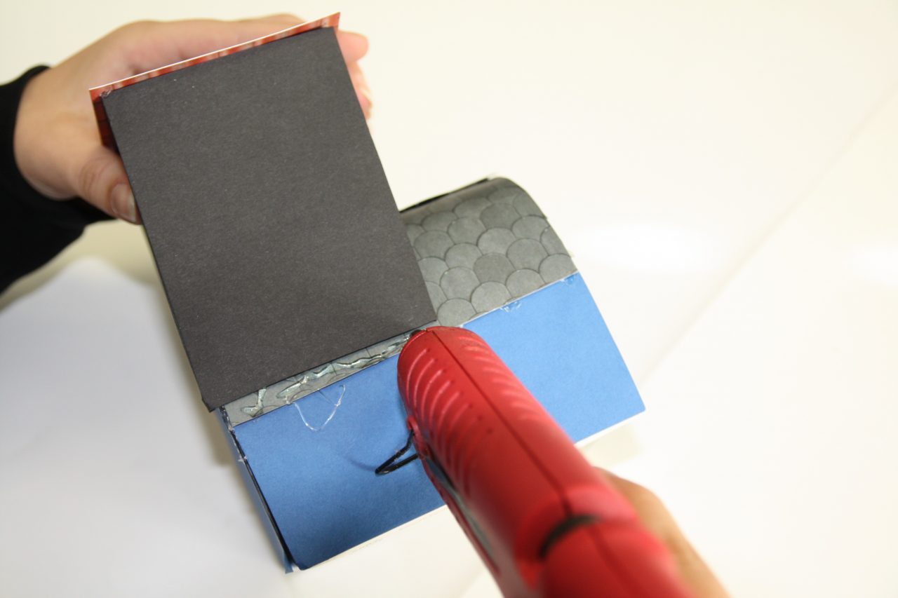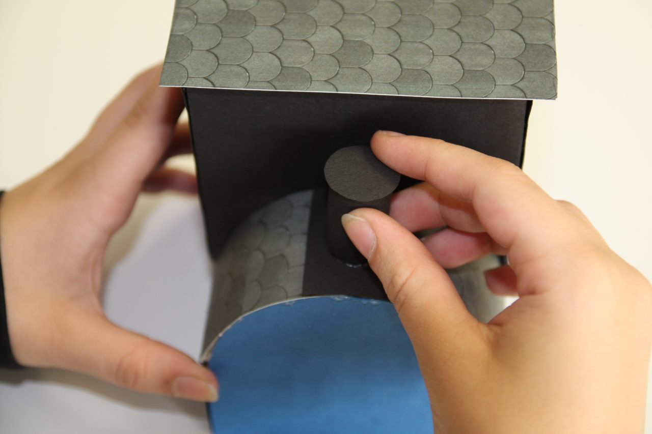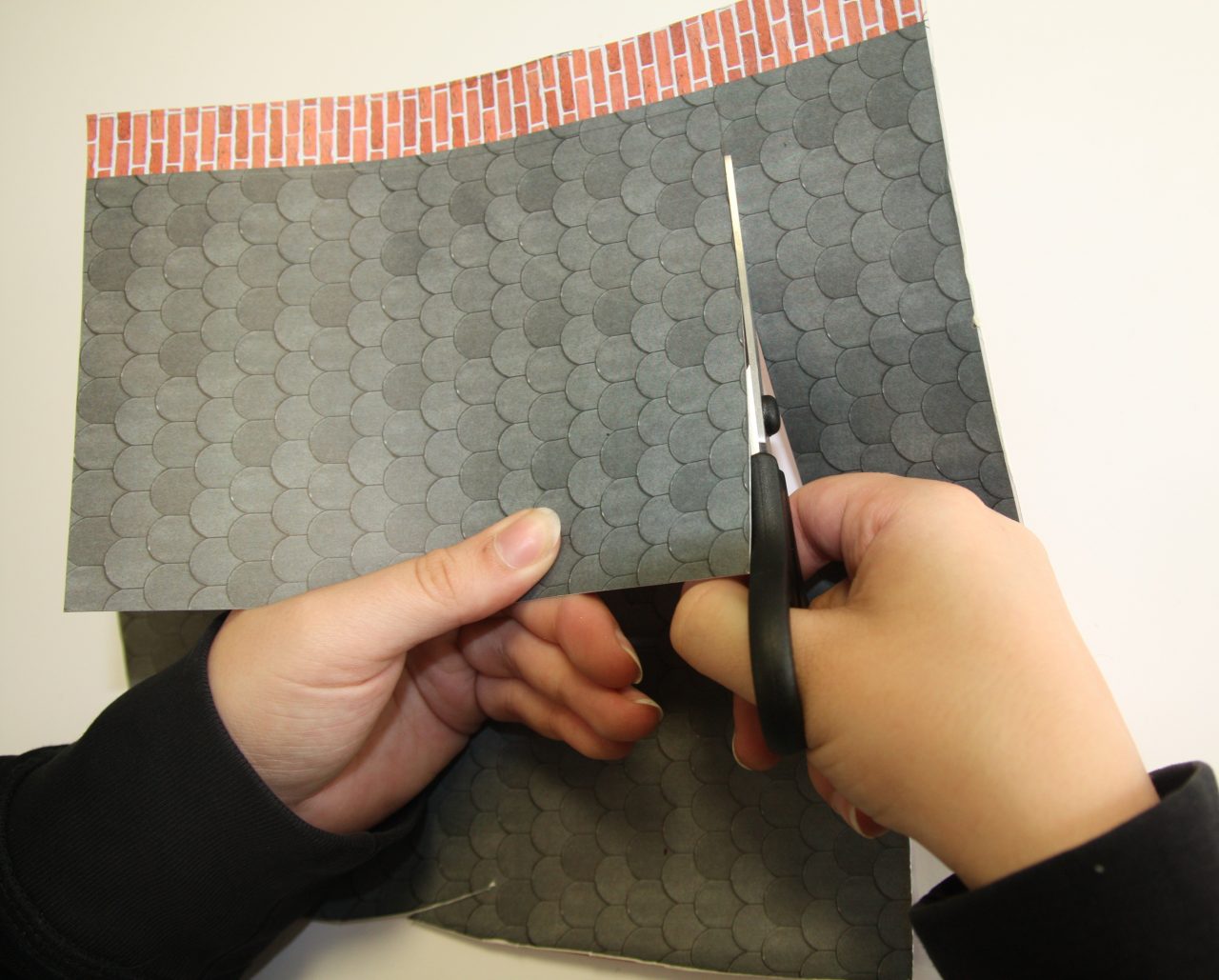 Da ich die Richtung des Musters nicht selbst entscheiden konnte, habe ich die Pappe dann doch in 2 Teile geschnitten, weil ich das Muster auf beiden Seiten richtig herum haben wollte, habe es dann aber doch falsch aufgeklebt… 🙁 Also an alle, die schon gemusterte Pappe haben: Macht nicht den gleichen Fehler wie ich! 🙂 Um die Kante zu verstecken, habe ich einfach einen schwarzen Streifen Pappe längs über das Dach geklebt.