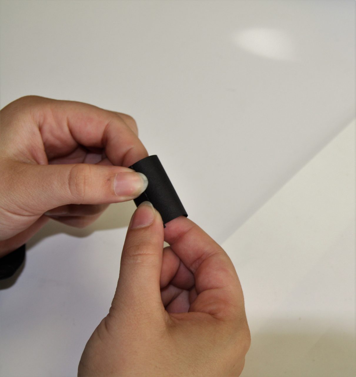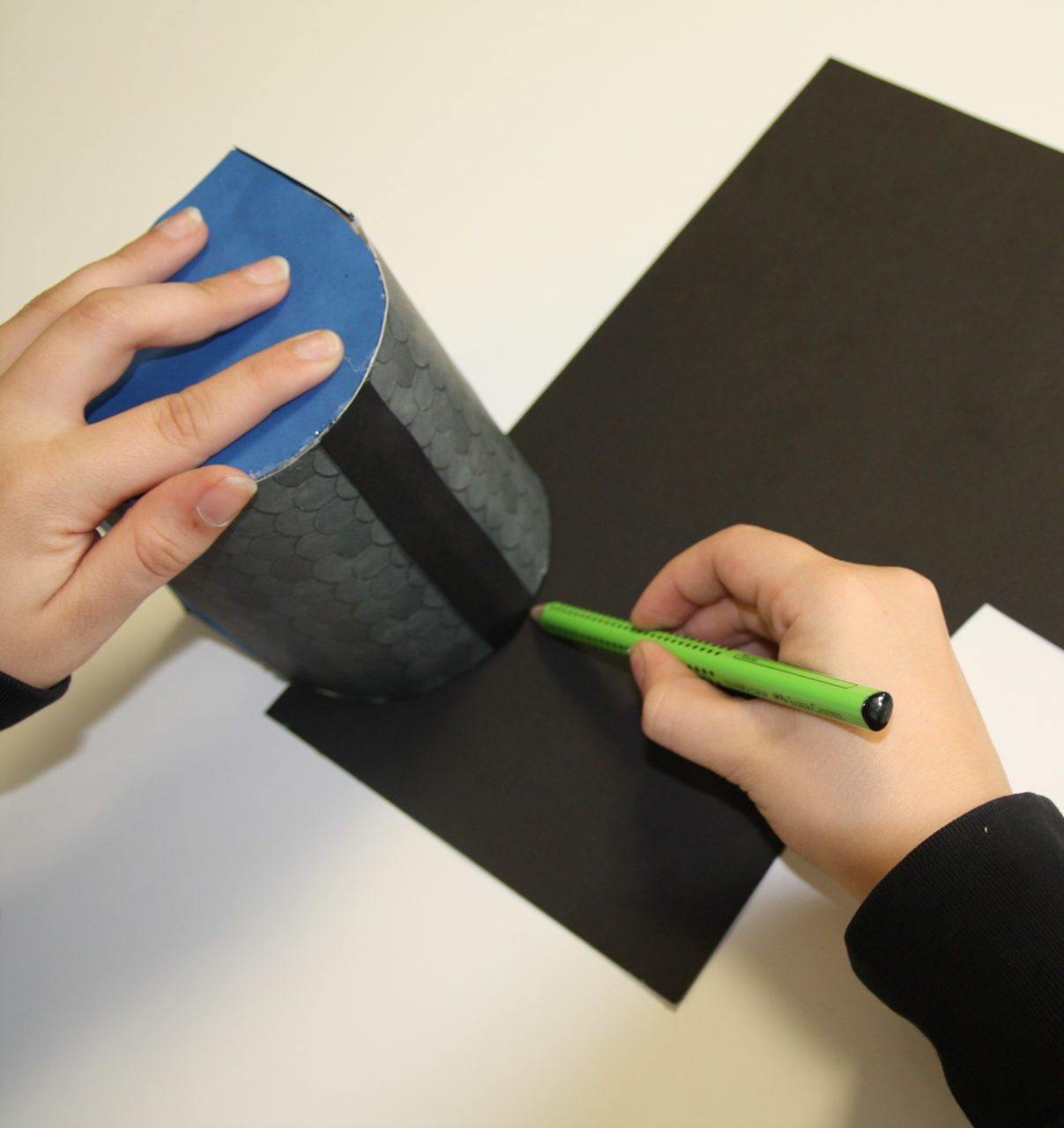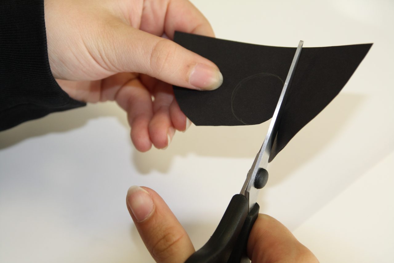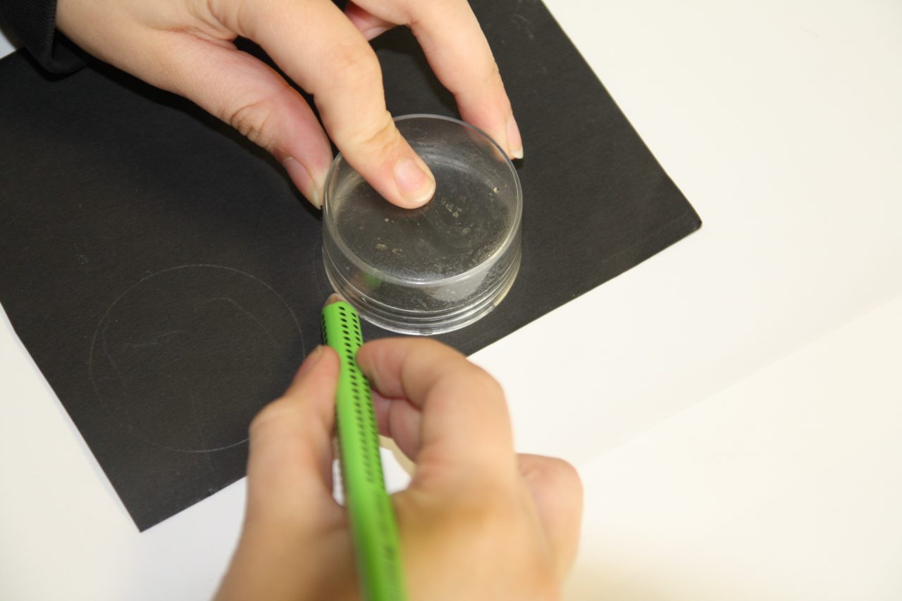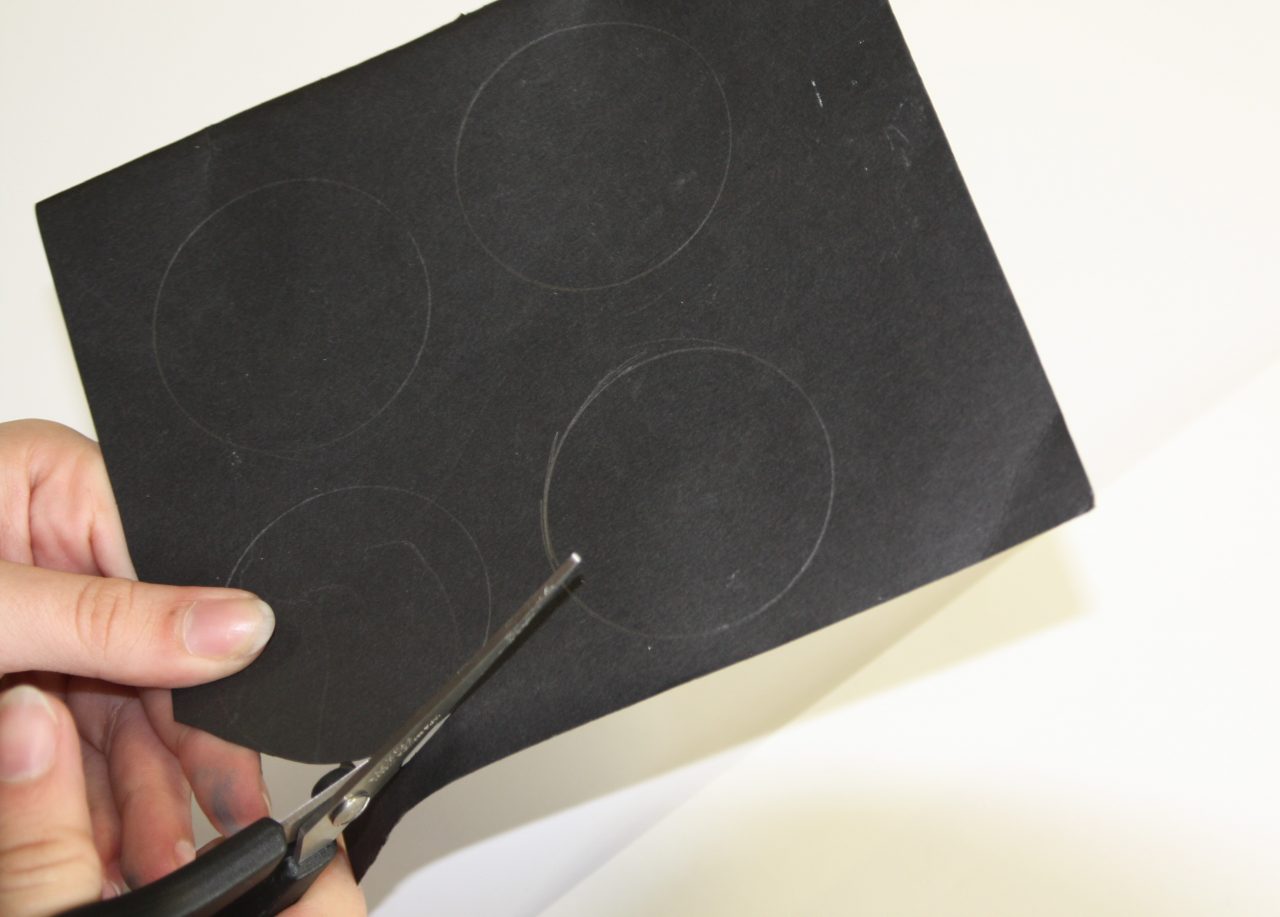 Als nächstes brauchen die Waggons Räder. Dazu habe ich mir die schwarze Pappe genommen. Achtet darauf, dass sie auch wirklich stabil ist, damit die Waggons am Ende richtig aufrecht stehen bleiben und nicht wegknicken. Jetzt könnt ihr euch irgendeinen runden Gegenstand nehmen und damit perfekte Kreise auf die schwarze Pappe zeichnen, die ihr dann ausschneiden und auf die Waggons kleben könnt.