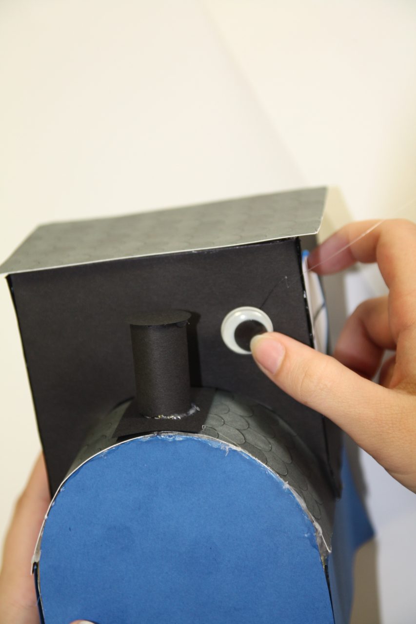 Als kleines Extra habe ich der kleinen Lokomotive einen Kamin gebastelt. Dazu müsst ihr einfach nur ein schwarzes Rechteck ausschneiden, zu einem Zylinder eindrehen und festkleben und einen Kreis darauf befestigen. Das Ganze wird dann wiederum auf der Lok festgeklebt.