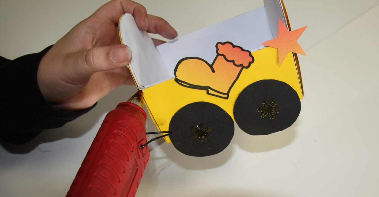 Für ein wenig mehr farbliche Abwechslung habe ich mir dann noch eine Regenbogenpappe genommen und darauf einen Stiefel und Sterne vorgezeichnet. Nachdem sie fertig ausgeschnitten waren, habe ich sie dann auf eine der Seiten des Wagons geklebt. Diese soll dann später natürlich nach vorne zeigen, also nehmt die Seite, die euch besser gelungen ist :)!