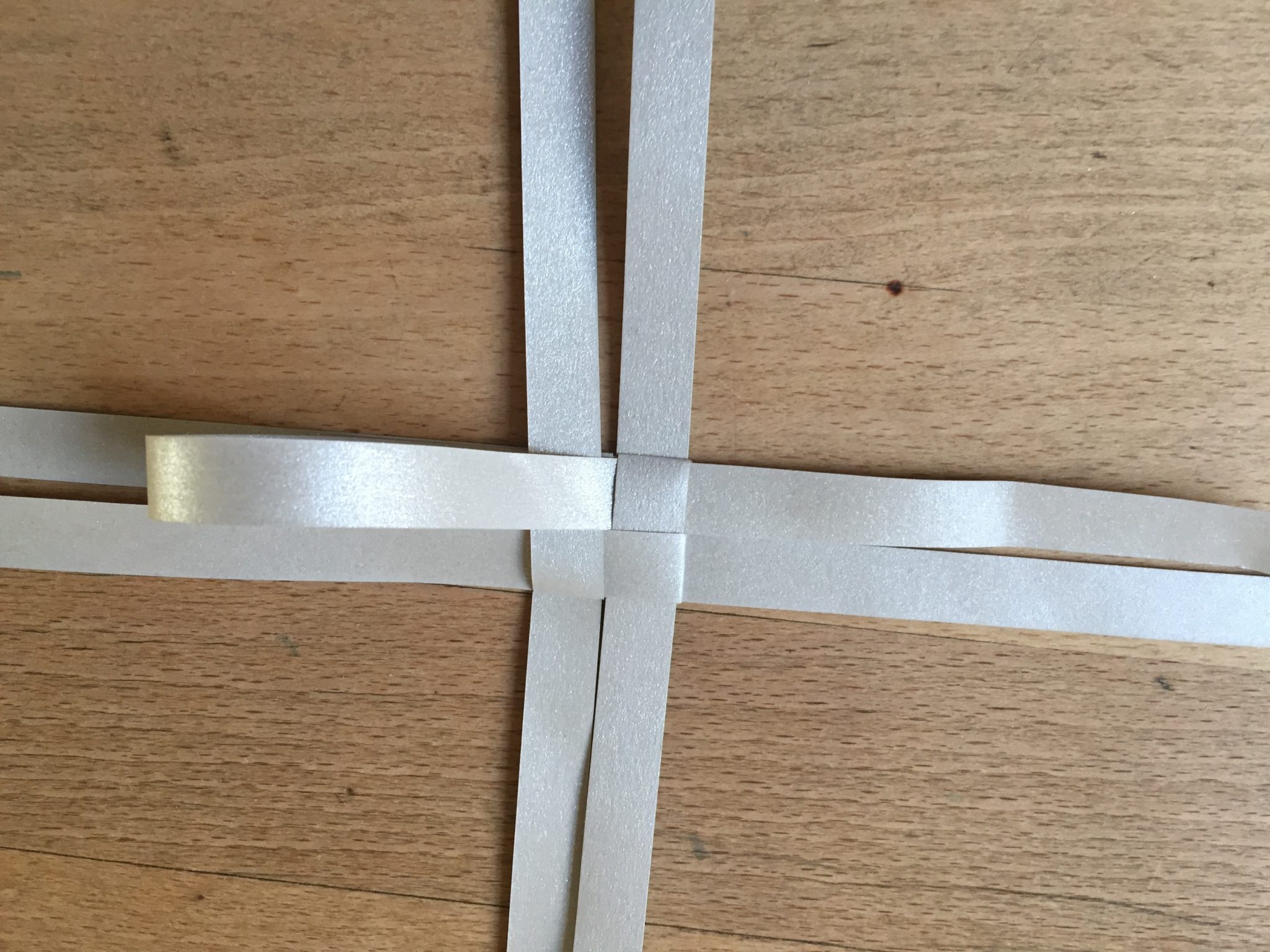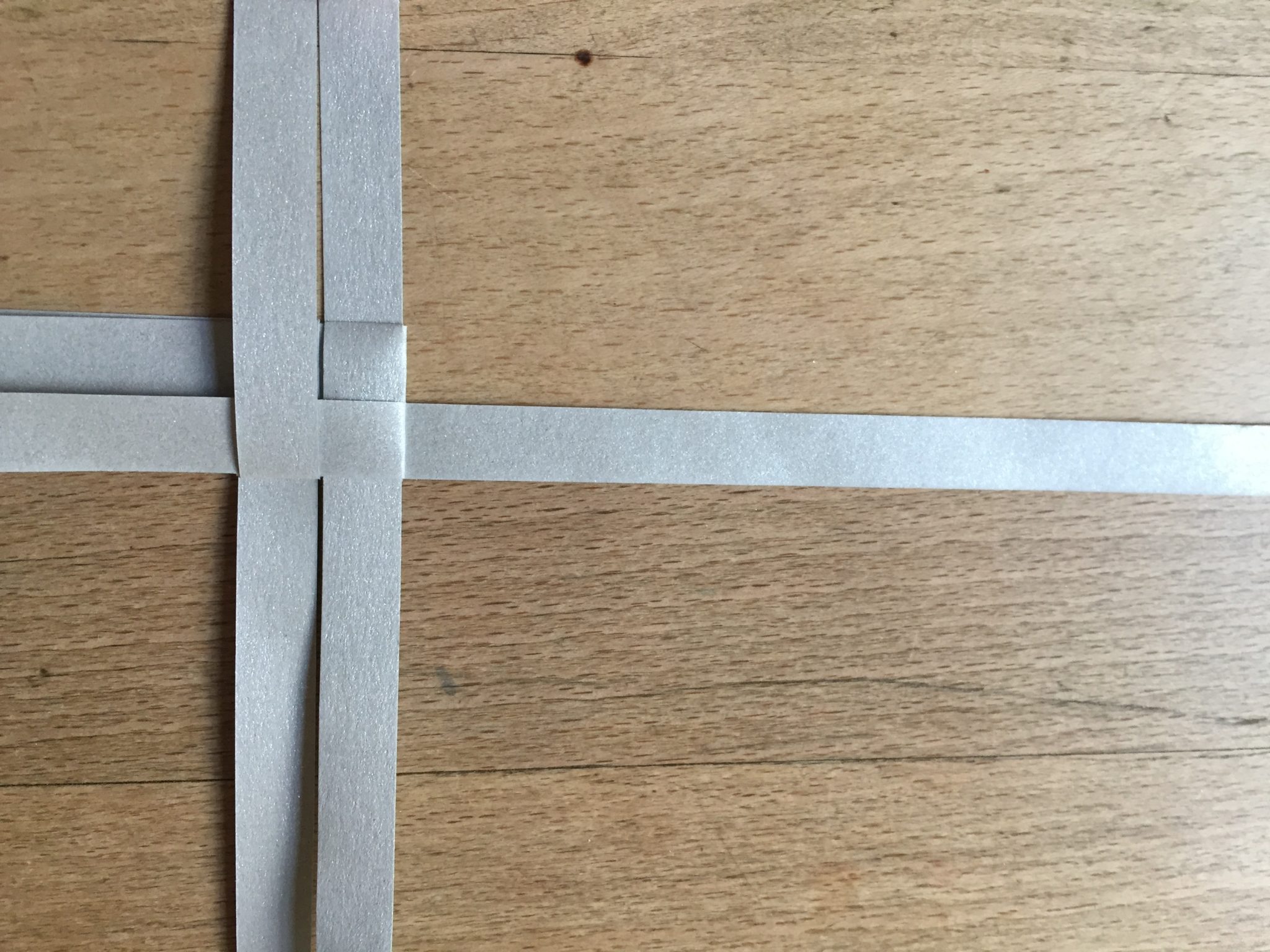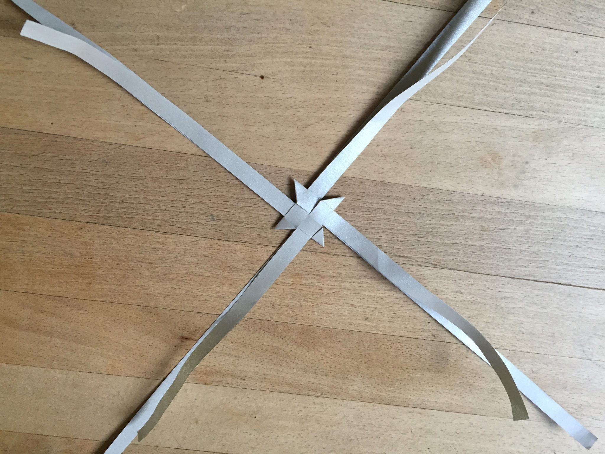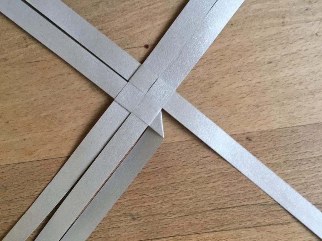 Zuerst werden vier gleichlange Streifen zugeschnitten. Diese stehen im Verhältnis 1 (Breite) zu 30 (Länge). Im folgenden Schritt werden alle vier Streifen zur Hälfte gefaltet. Die Enden werden auf einer Seite schräg abgeschnitten. Die zur Hälfte gefalteten Streifen werden so umeinander gelegt, dass ein geflochtenes Viereck entsteht. Dies wird nun zusammen gezogen.