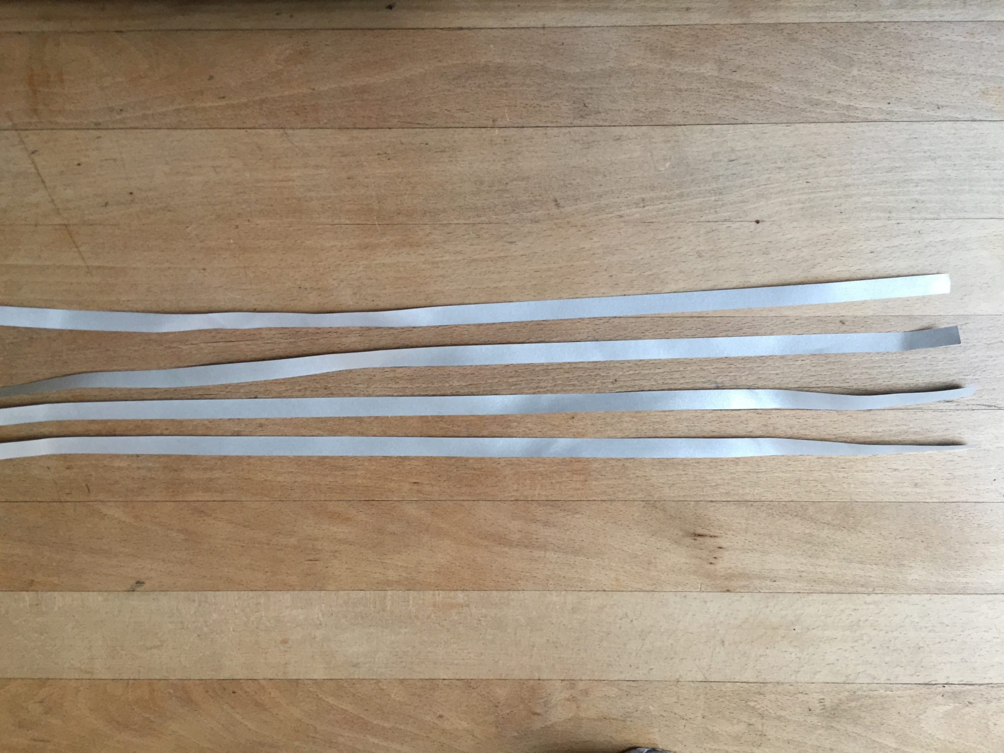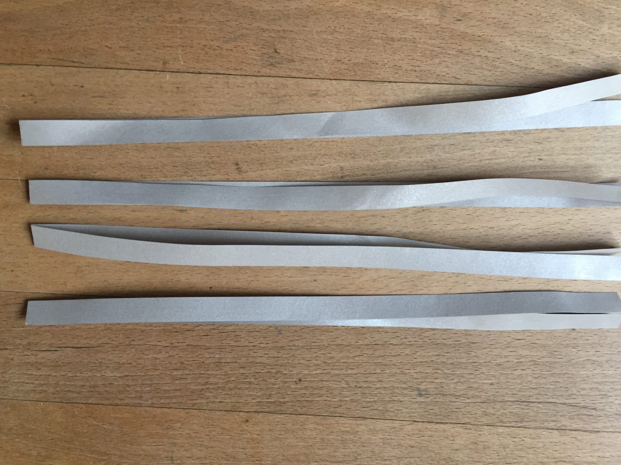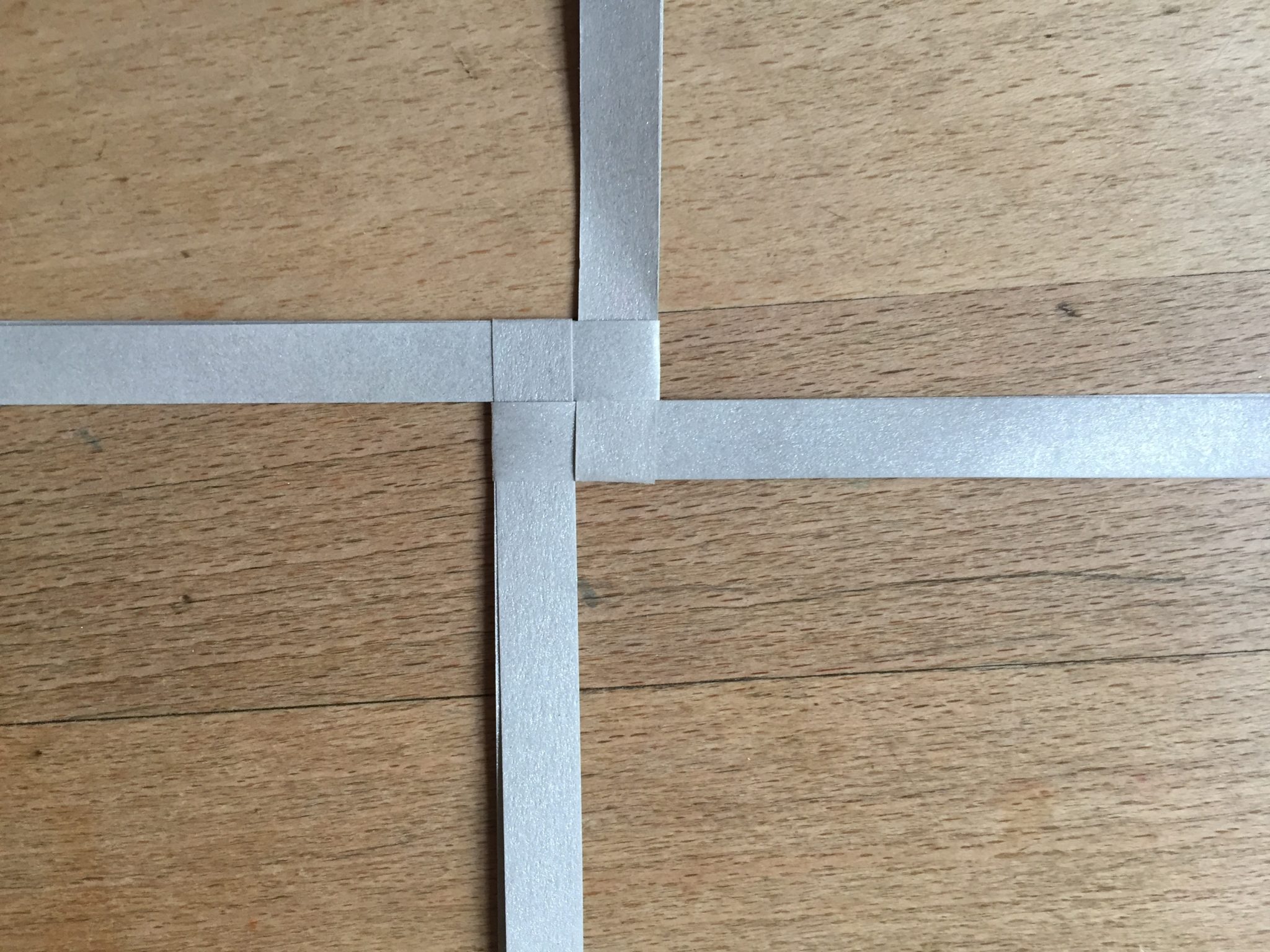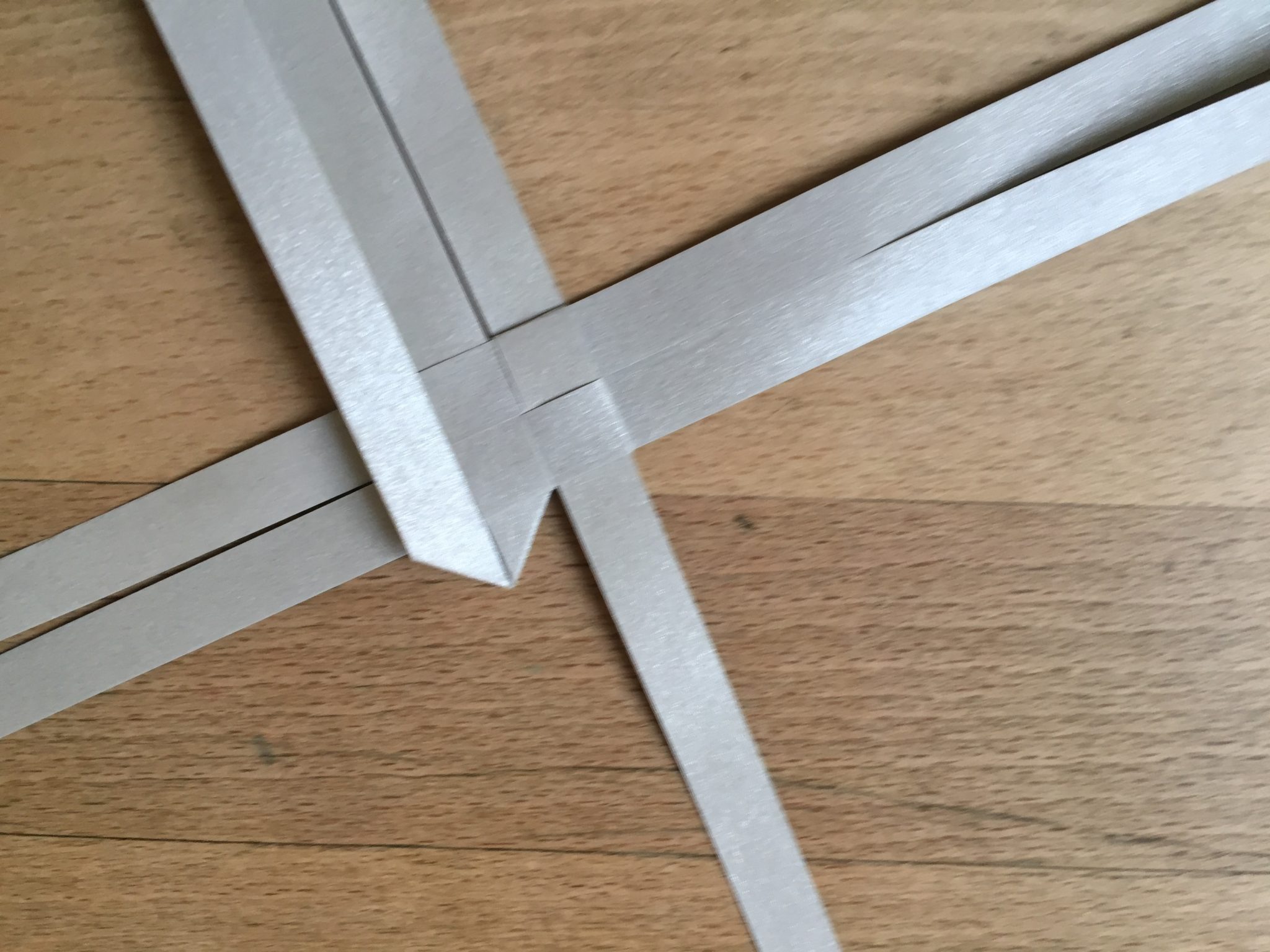Zuerst werden vier gleichlange Streifen zugeschnitten. Diese stehen im Verhältnis 1 (Breite) zu 30 (Länge). Im folgenden Schritt werden alle vier Streifen zur Hälfte gefaltet. Die Enden werden auf einer Seite schräg abgeschnitten. Die zur Hälfte gefalteten Streifen werden so umeinander gelegt, dass ein geflochtenes Viereck entsteht. Dies wird nun zusammen gezogen.