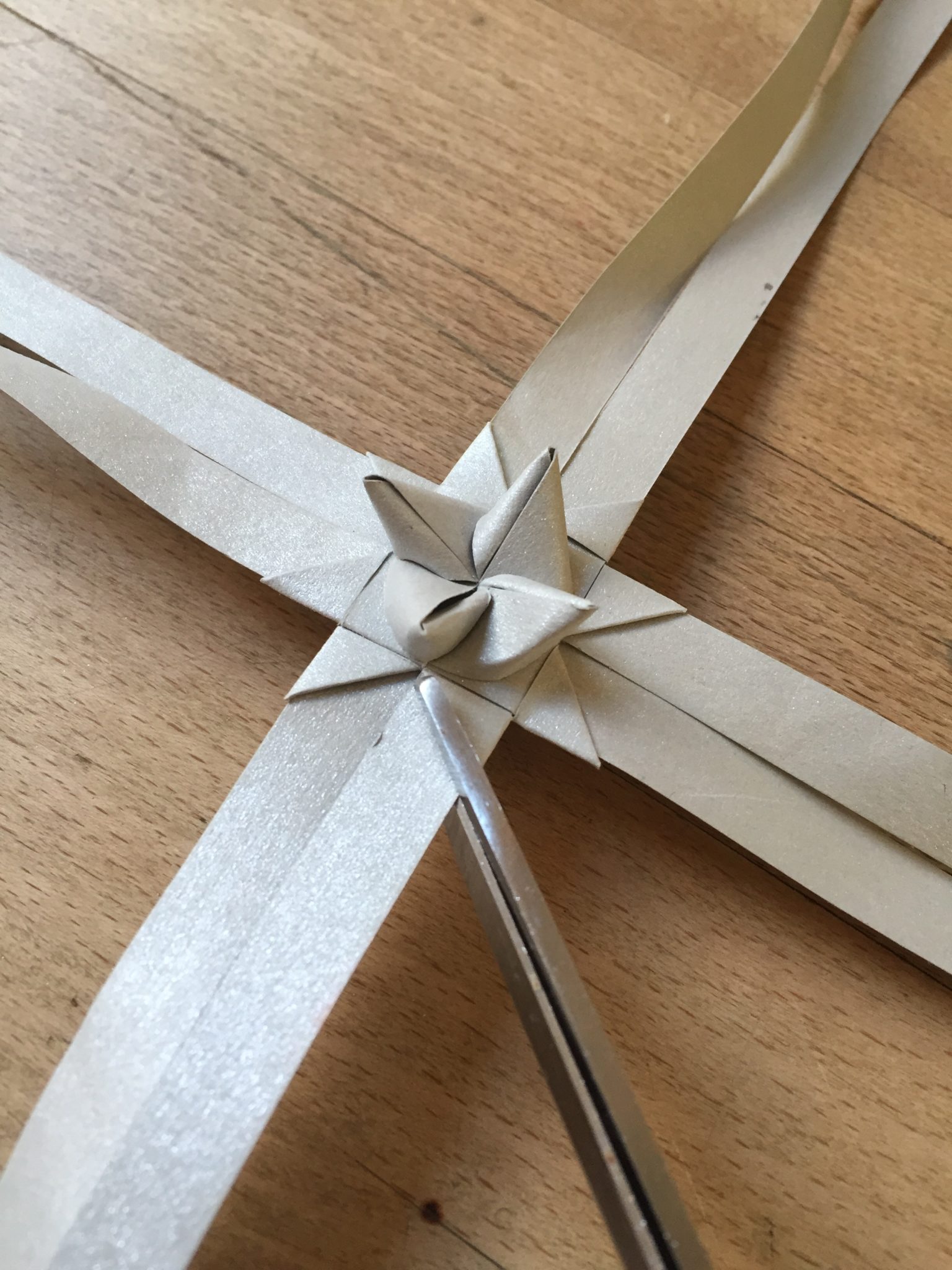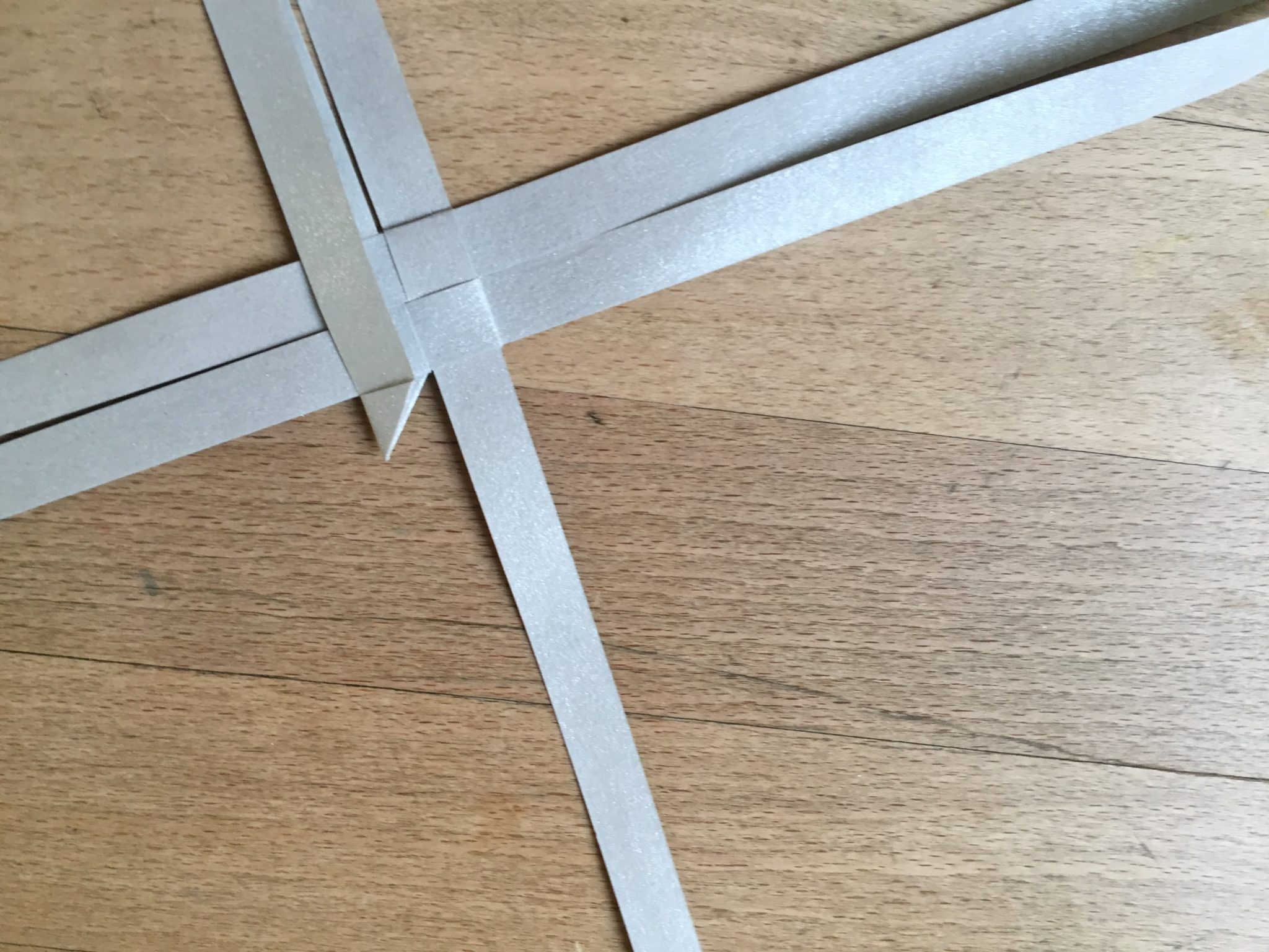 Nun, da vier Ecken entstanden sind, drehst du den Stern um und arbeitest die nächsten vier Ecken genau so. Dann werden wie im zweiten Schritt die ersten drei Streifen zur Mitte hin ineinander geflochten und der letzte Streifen unter dem ersten durchgezogen.
