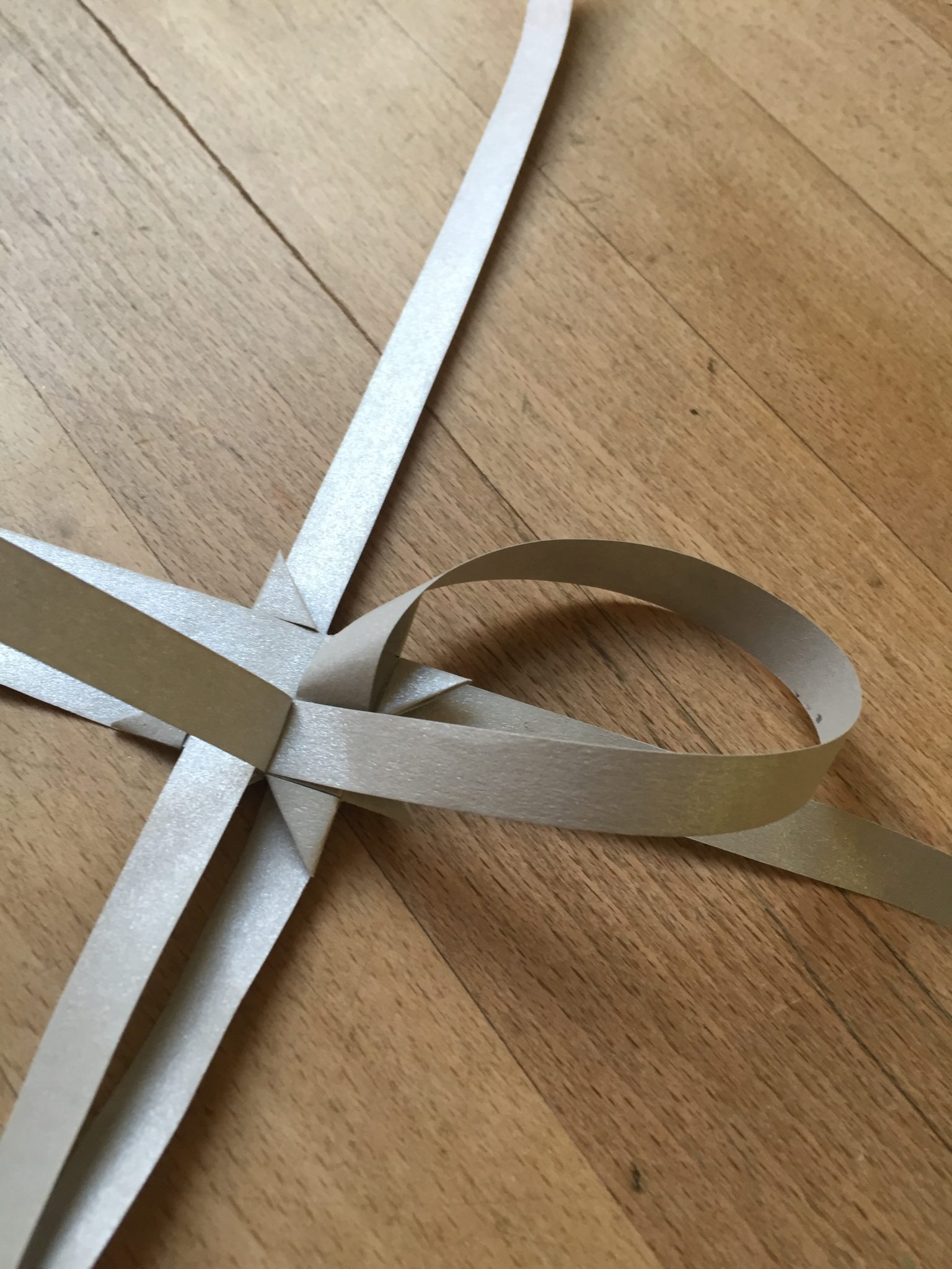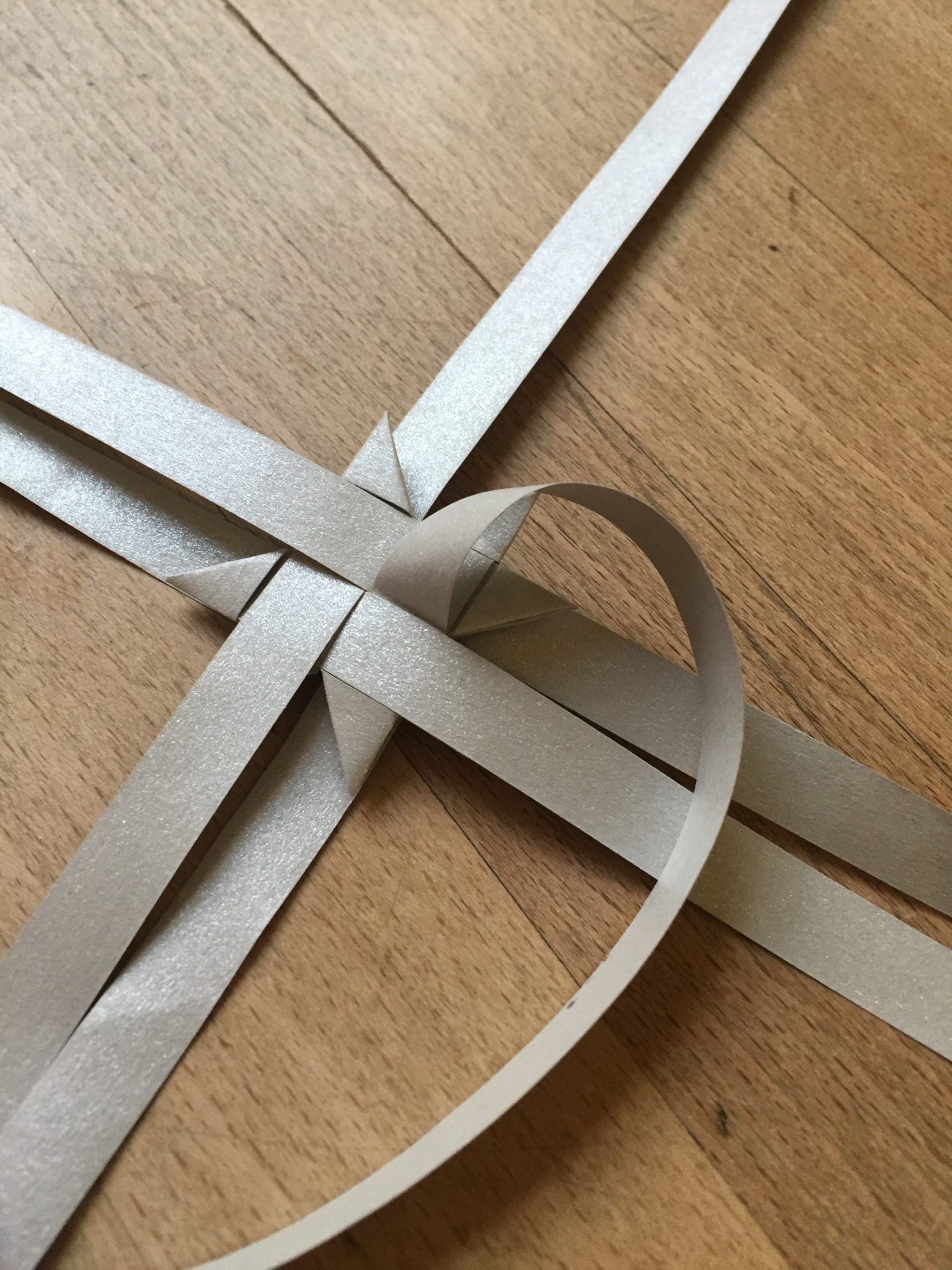 Als nächstes wird jeder Streifen nun rechtsherum gebogen und unter dem rechts daneben befindlichen hindurchgezogen.
