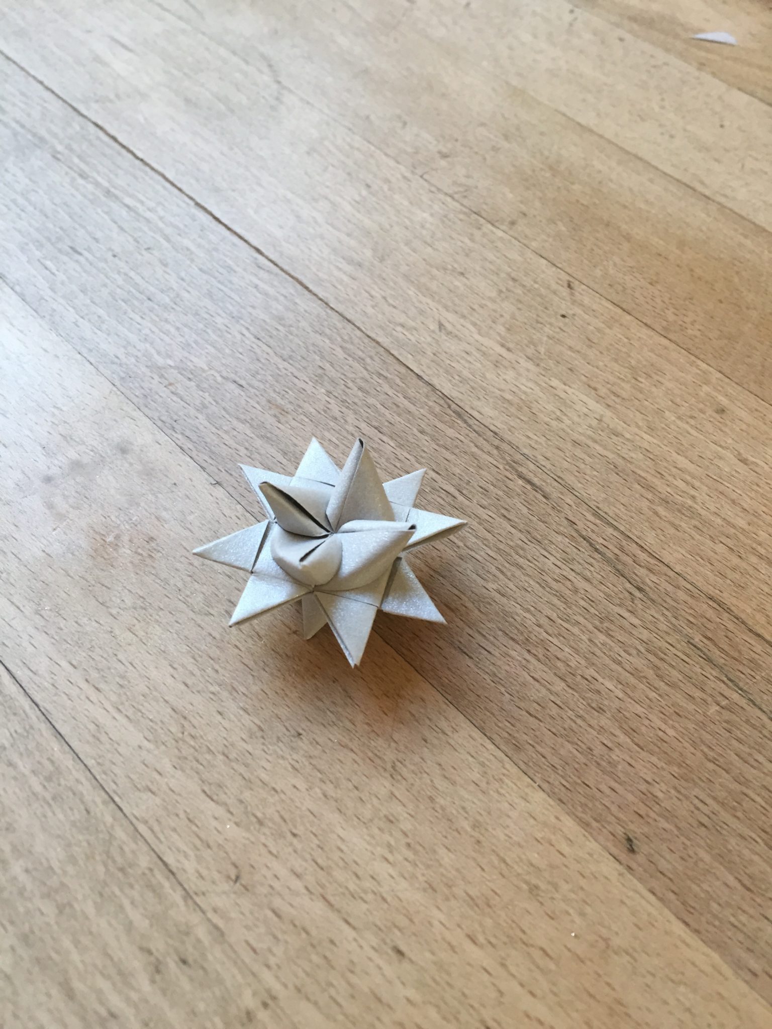 Fast fertig! Da du nun auf der einen Seite vier plastische Spitzen hast, musst du den Stern nur noch umdrehen und dasselbe auf der anderen Seite wiederholen. Dann kannst du die überschüssigen Enden abschneiden.