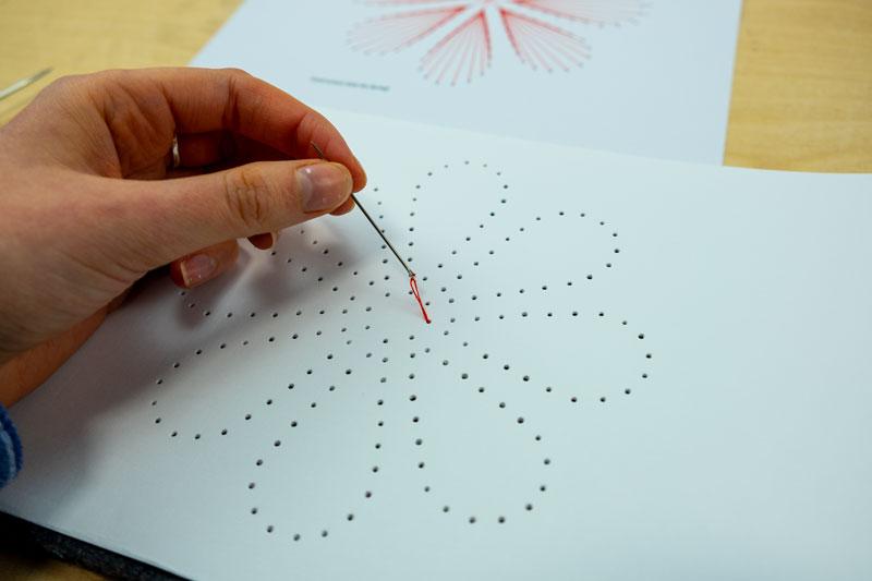 - Materialien besorgen: Du brauchst nicht viel, um anzufangen – Faden, Nadel, die Vorlage und je nach Technik Papier oder ein anderes Material.