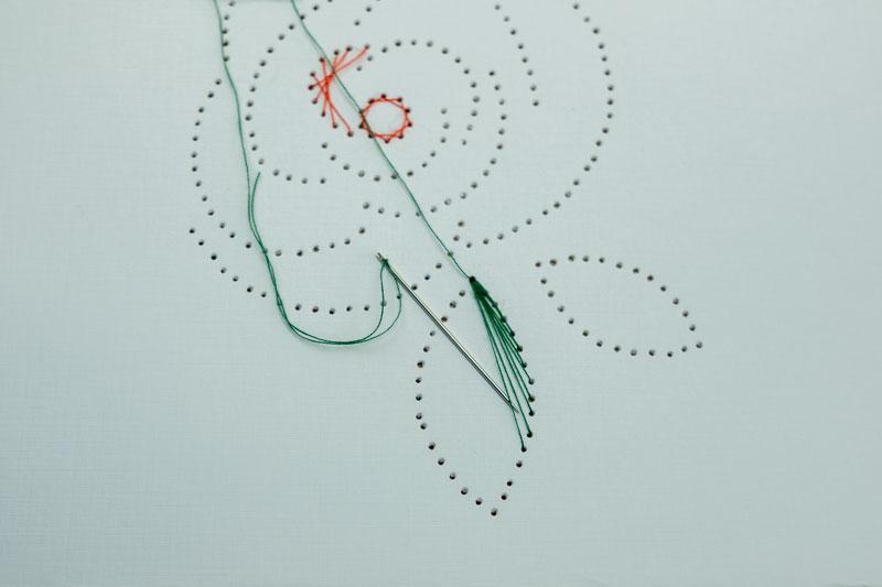 1. Fädeln Beginnen: Nachdem alle Punkte übertragen sind, entfernt ihr die Papier-Vorlage. Nun beginnt der kreative Teil – das Fädeln. Ihr fädeöt Garn in eine Nadel und stickt einfach wie auf der Vorlage angegeben von Punkt zu Punkt.