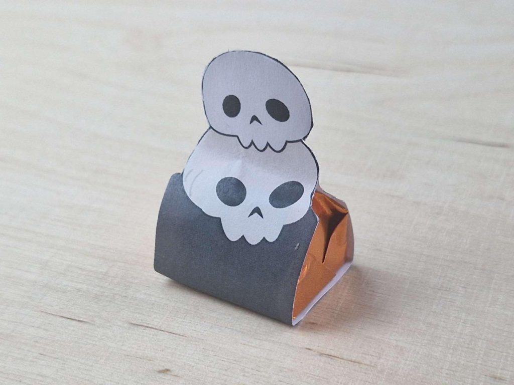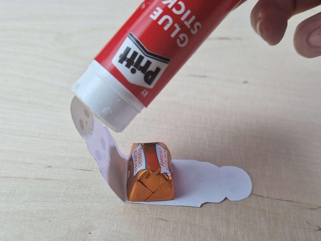 Danach nimmst du einen Ferrero Küsschen legst es in die Vorlage, dann umwickelst die Schokolade mit der Vorlage und befestigst diese mit einem Klebestift.