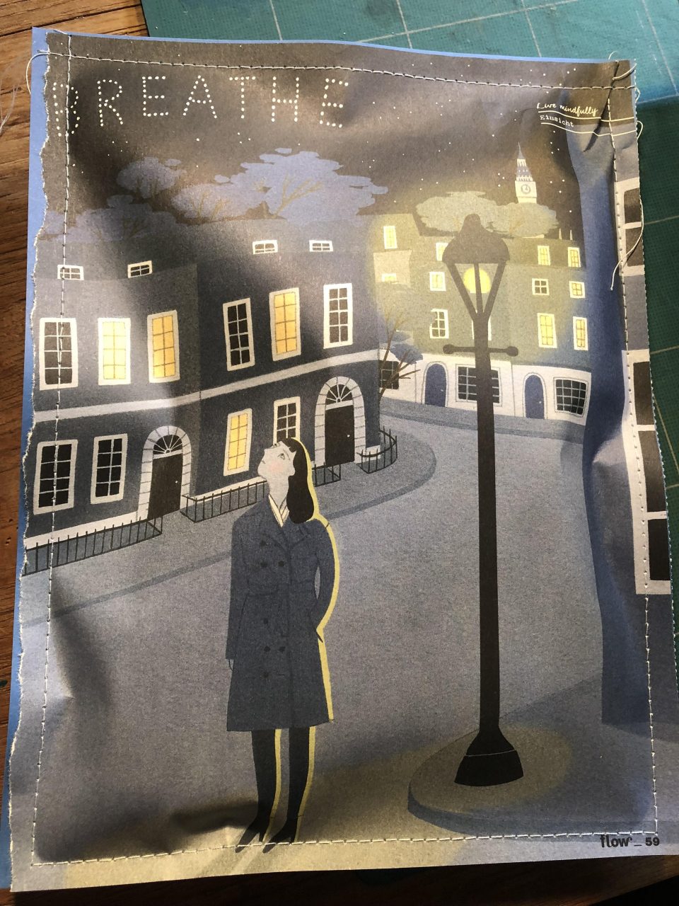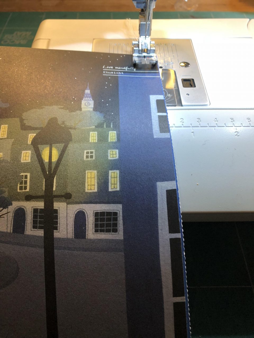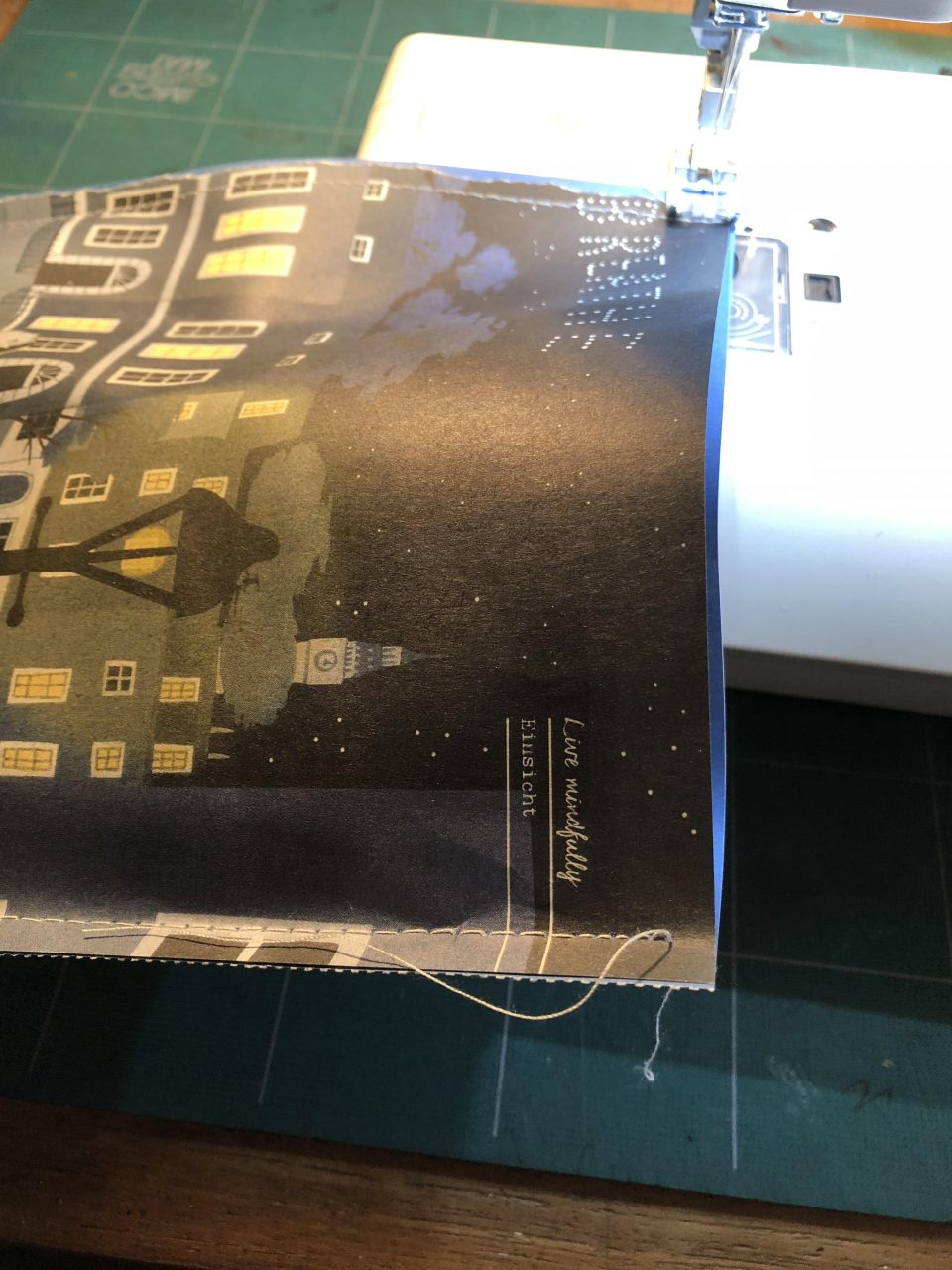 Nachdem ihr eure Entscheidung getroffen habt, könnt ihr die beiden Papiere auch schon zusammennähen. Dabei ist wichtig, dass das Bild und das Muster nach außen zeigen. Ich habe hierfür einen Gradstich gewählt. Am besten haltet ihr einen Nahtabstand von 0,5 cm ein, damit das Verpackte auch sicher in der Tüte liegt ;-)) Witzig ist es auch, andersfarbiges Garn zu benutzen. Ihr näht die drei Seiten mit einer Naht zusammen. An den Ecken hebt ihr jeweils das Füsschen der Nähmaschine an und dreht die Papiere um 90 Grad und näht weiter. Oben lasst ihr offen, damit das Geschenk hineingelegt werden kann.