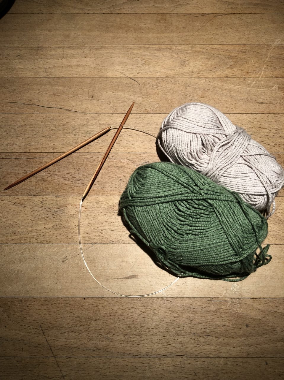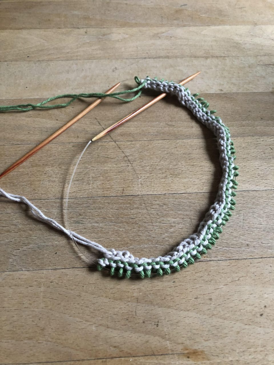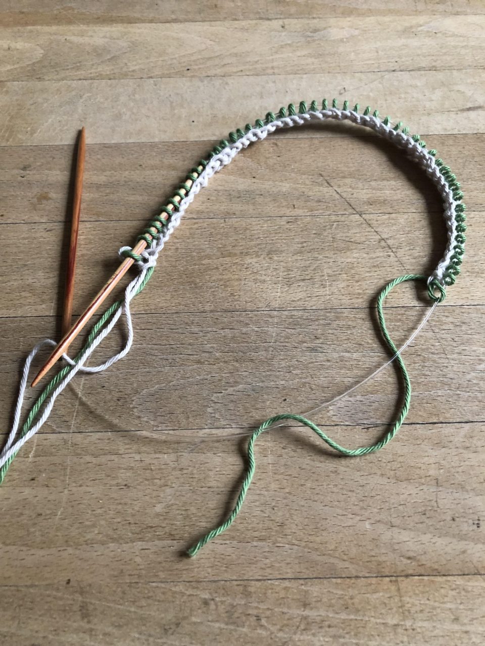 Nachdem du 50 Maschen – ich habe in beige angefangen – aufgenommen hast, strickst du die erste Reihe mit rechten Maschen in beige ab. Danach schiebst du das bereits Gestrickte auf die Nadel zurück, so dass du diese Reihe sozusagen nochmal strickst – diesmal aber mit der grünen Wolle. Auch hier nur rechte Maschen. Da du in jeder Reihe einen Farbwechsel hast, solltest du keine Randmasche stricken.