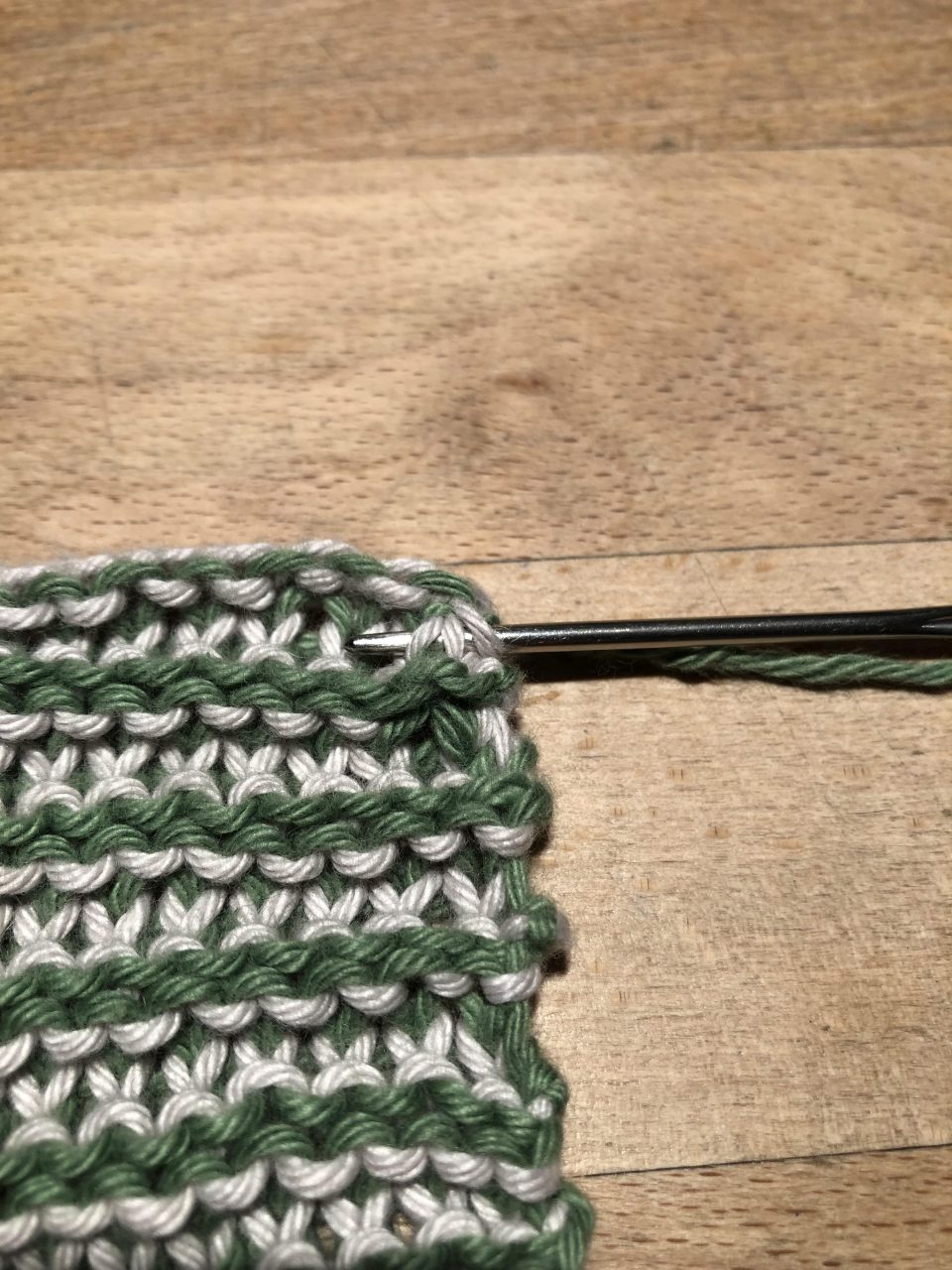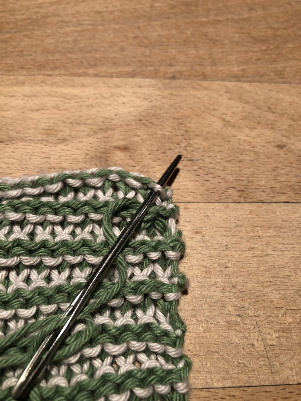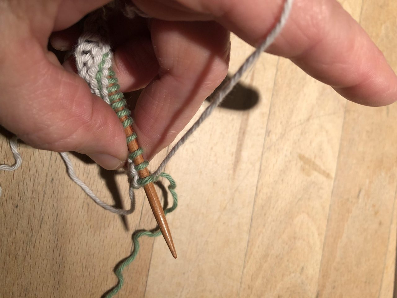 Damit am Rand eine schöne Kante zu erhalten, musst du immer den Faden, den du gerade nicht benutzt (hier jetzt grün) mit „hoch nehmen“. Dazu legst du den grünen Faden über den aktuellen (hier jetzt beige) Strickfaden und strickst ganz normal weiter.