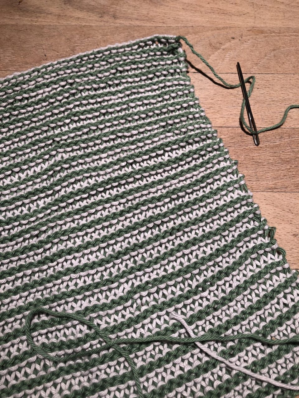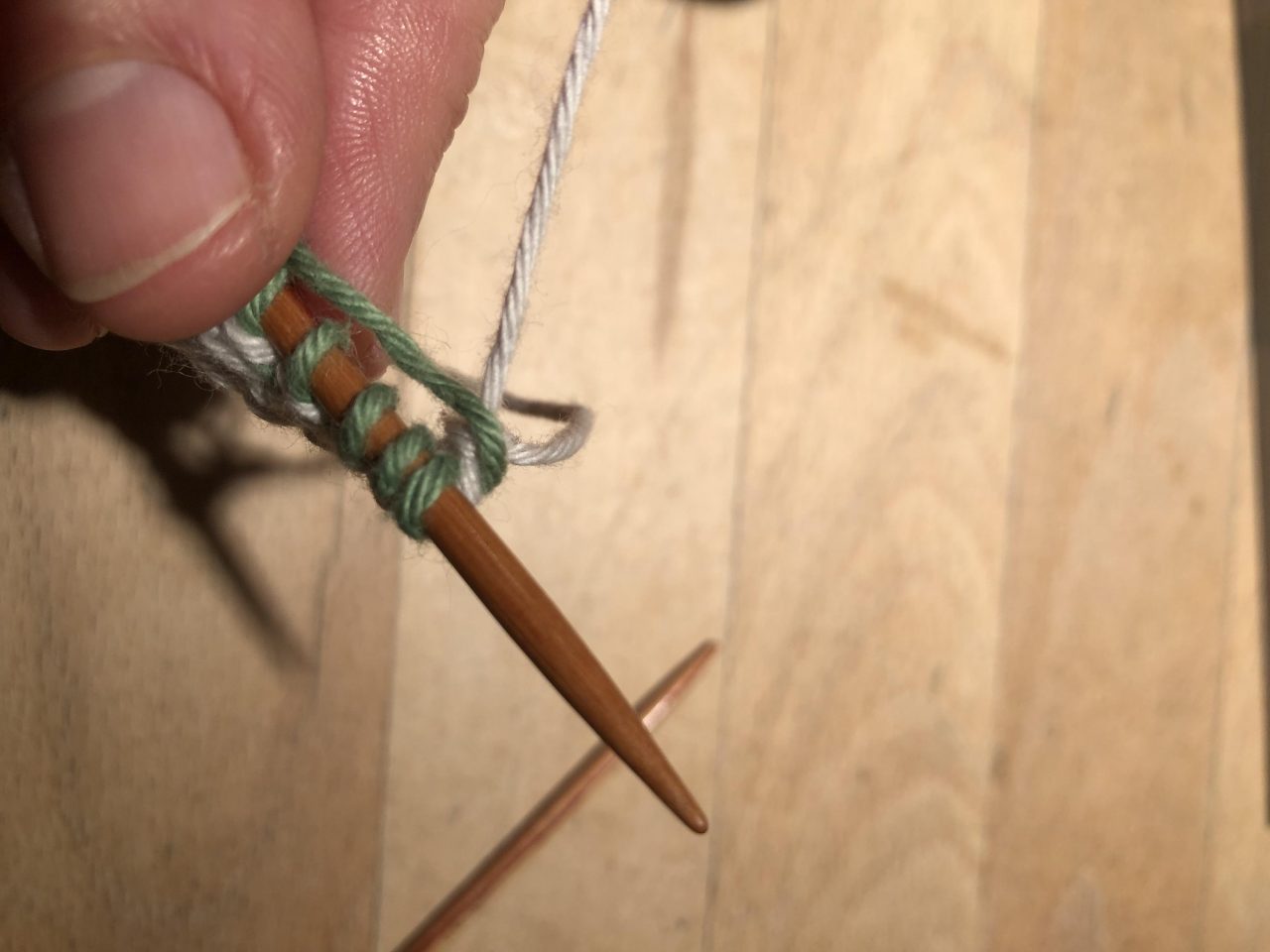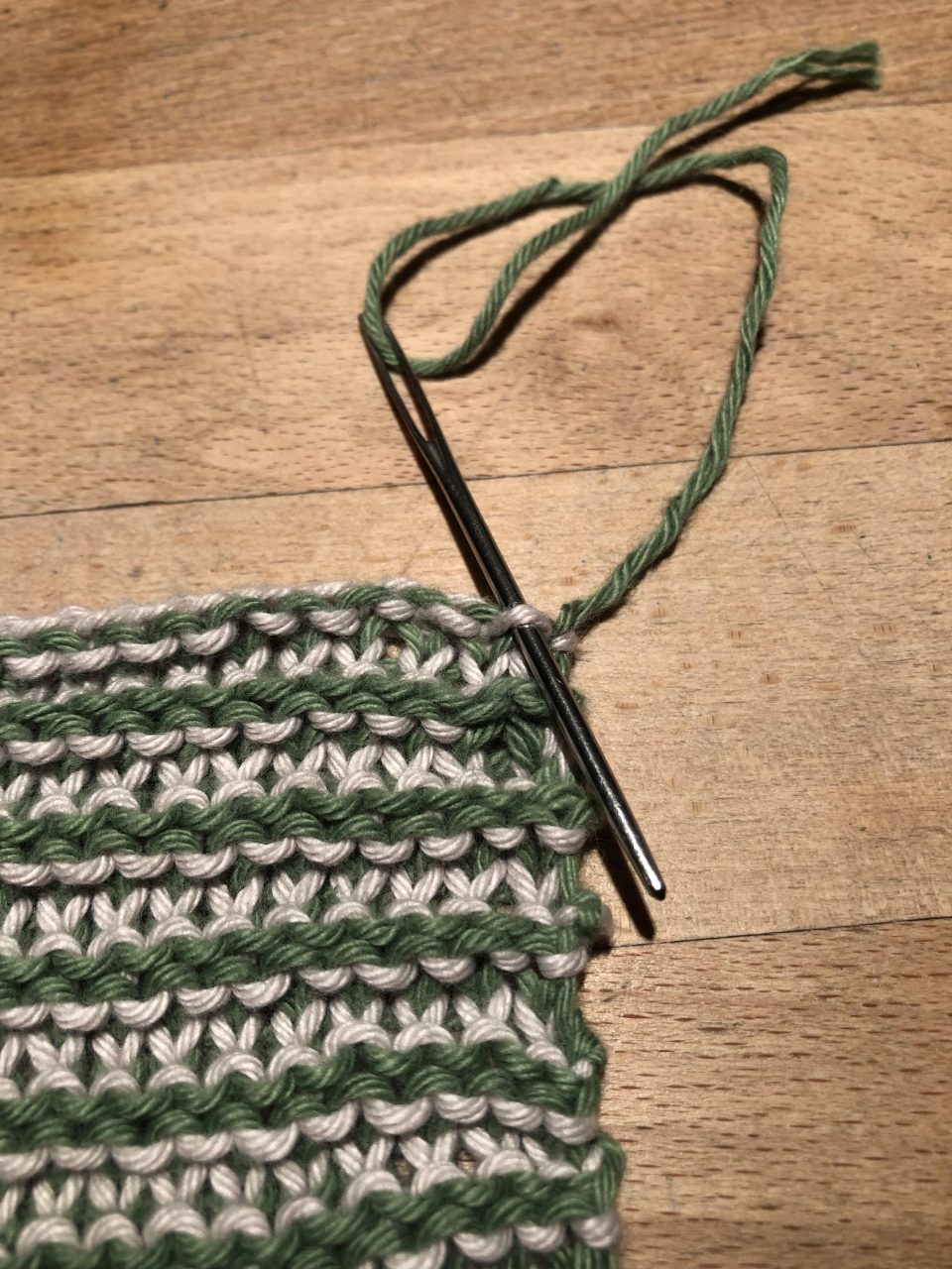 Damit am Rand eine schöne Kante zu erhalten, musst du immer den Faden, den du gerade nicht benutzt (hier jetzt grün) mit „hoch nehmen“. Dazu legst du den grünen Faden über den aktuellen (hier jetzt beige) Strickfaden und strickst ganz normal weiter.