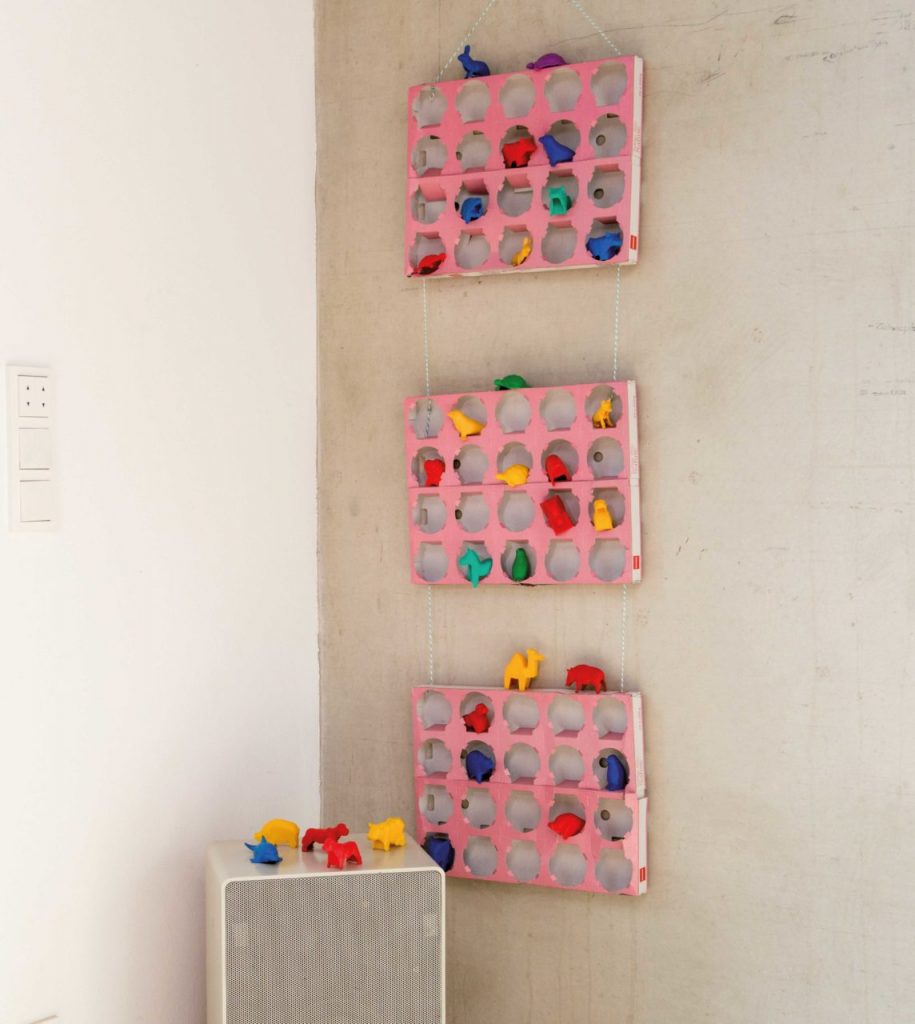 - Damit das Regal stabil ist, werden die Schnüre mehrfach verknotet. So könnt ihr beliebig viele Sahnebecherschachteln aneinanderreihen und euer Regal euren Bedürfnissen anpassen.