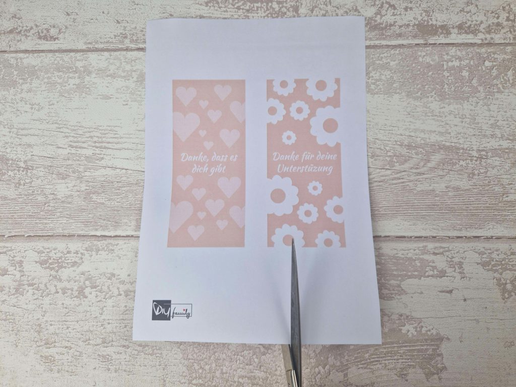 Nun schneidest du die einzelnen „Sprüche“ aus. Ich empfehle dir, diese innen am Rand auszuschneiden, so hast du die Umrandungslinie direkt weggeschnitten.