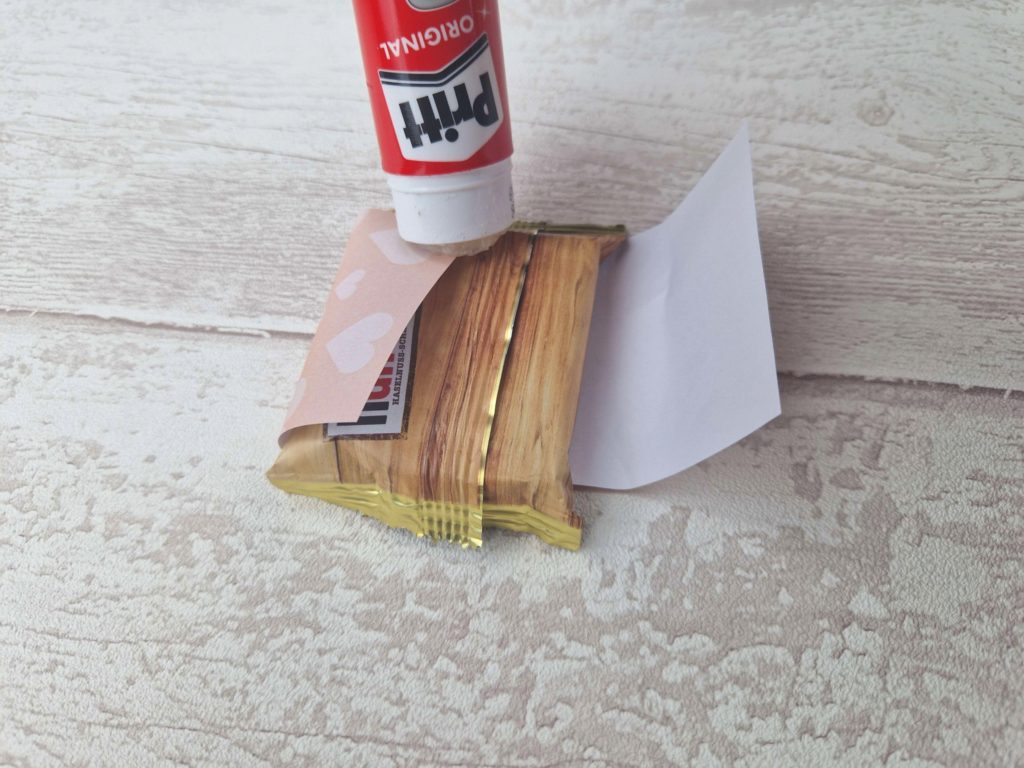 Danach nimmst du einen Hanuta-Riegel und umwickelst den Riegel mit der Vorlage und befestigst diese mit einem Klebestift oder Klebeband.
