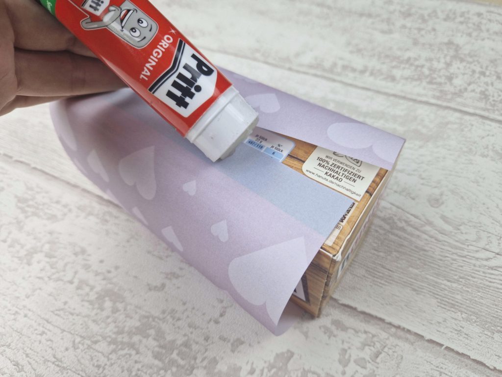 Die Verpackung umwickelst du mit der großen Vorlage und befestigst diese mit einem Klebestift. Und schon bist du fertig 😊!