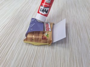 Danach nimmst du einen Hanuta-Riegel und umwickelst den Riegel mit der Vorlage und befestigst diese mit einem Klebestift oder Klebeband.