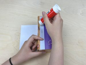 Danach nimmst du eine Haselnuss-Schnitte legst die Vorlage auf die Hanuta umwickelst die Haselnuss-Schnitte mit der Vorlage und befestigst diese mit einem Klebestift oder Klebeband. Das machst du mit allen 10 Haselnuss-Schnitten. Fertig!