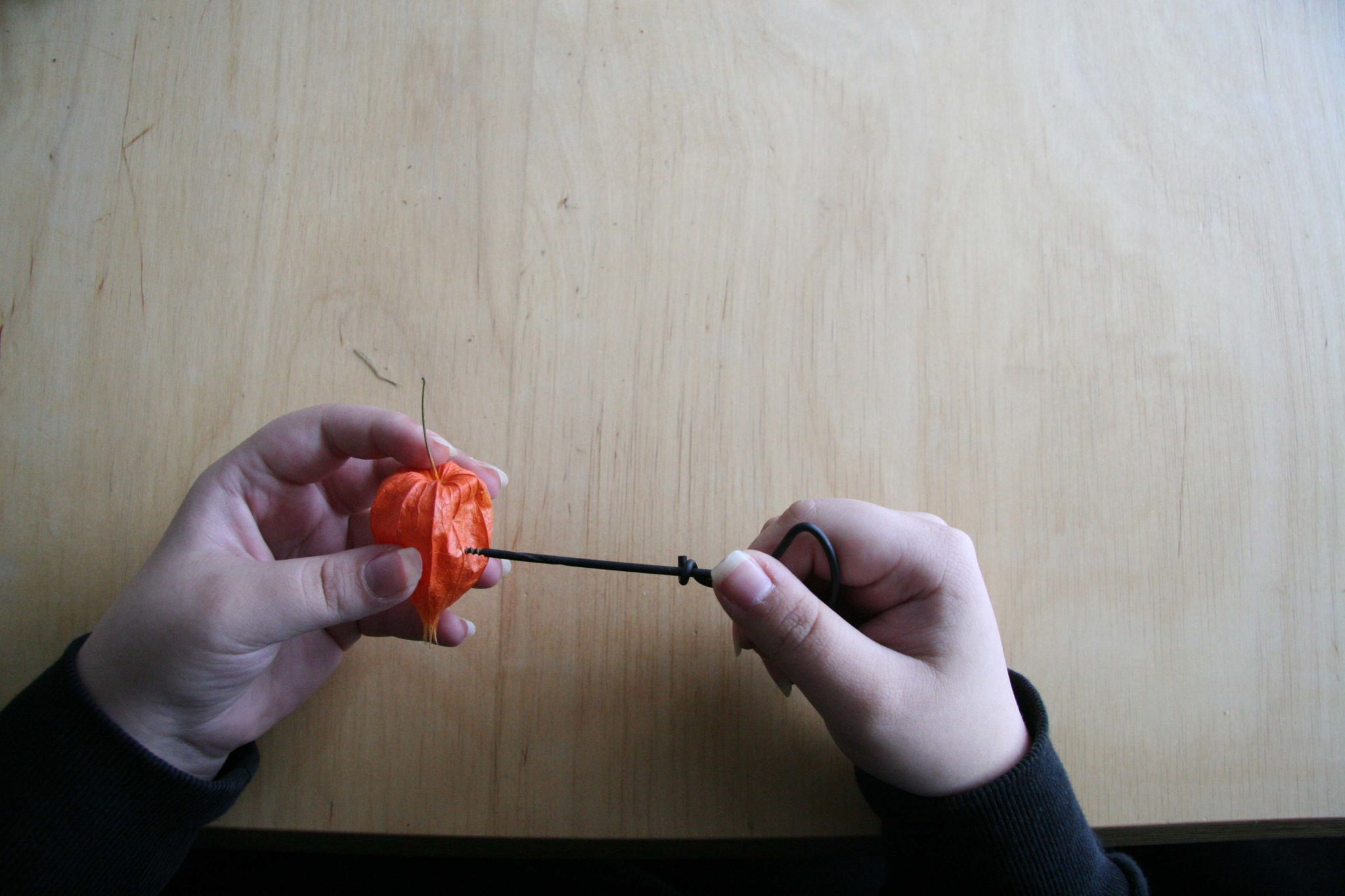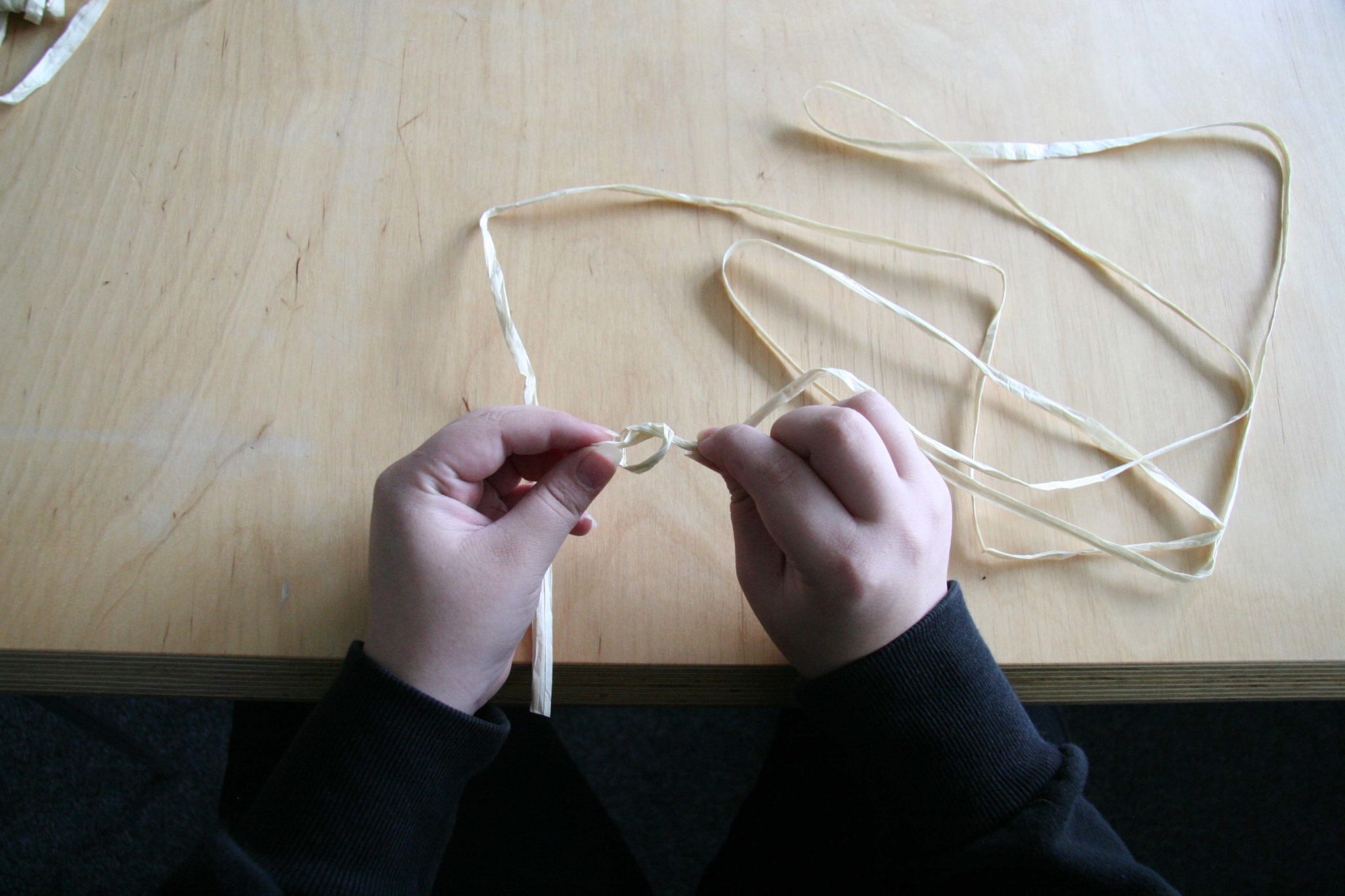 Im zweiten Schritt, solltest Du dir ein Stück Schnur nehmen und an einem Ende einen Knoten machen, zu Not musst Du mehrere machen, damit deine Materialien nicht von der Schnur rutschen. Auch bei der Wahl der Schnur gibt es keine Einschränkungen.