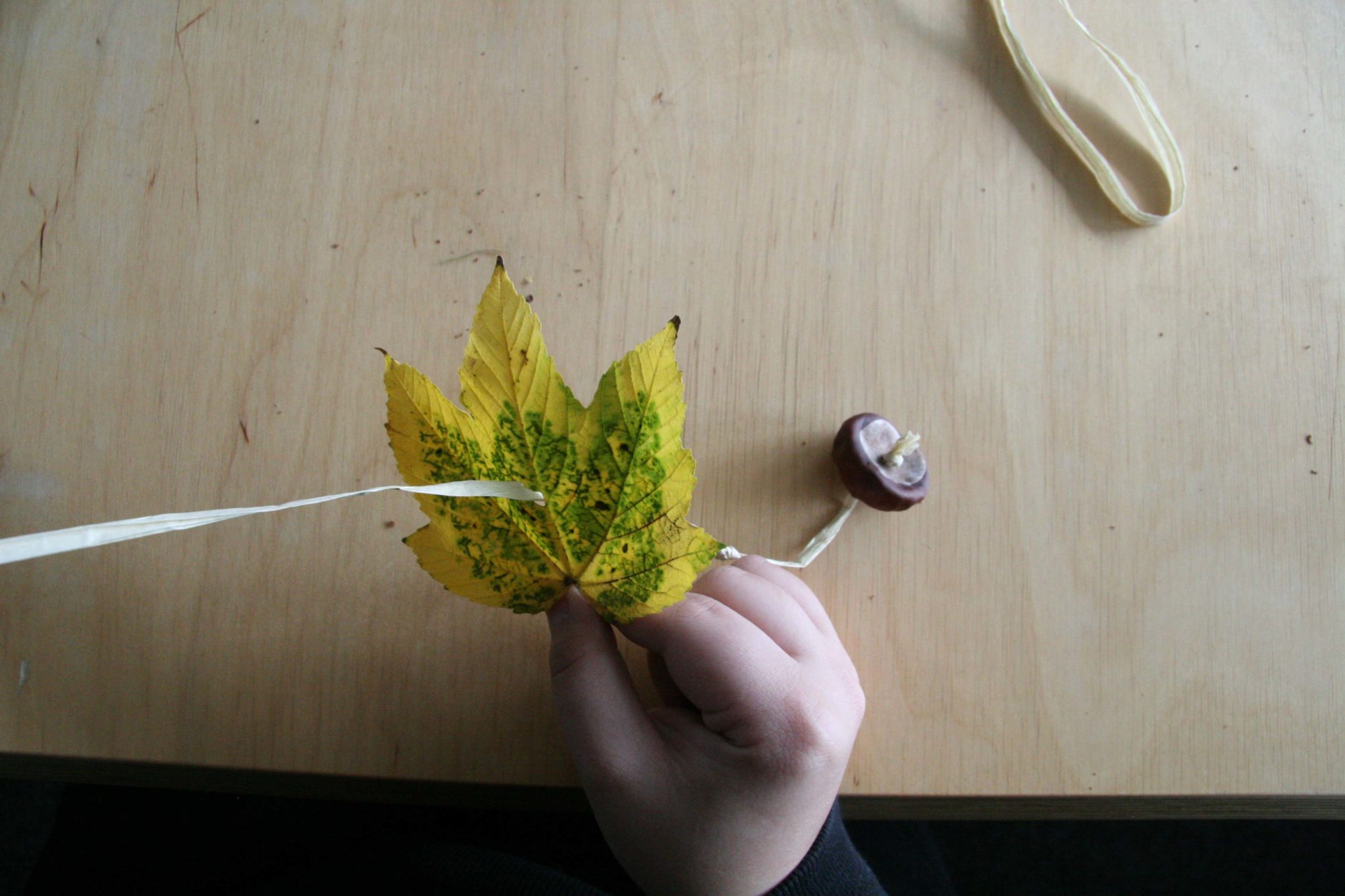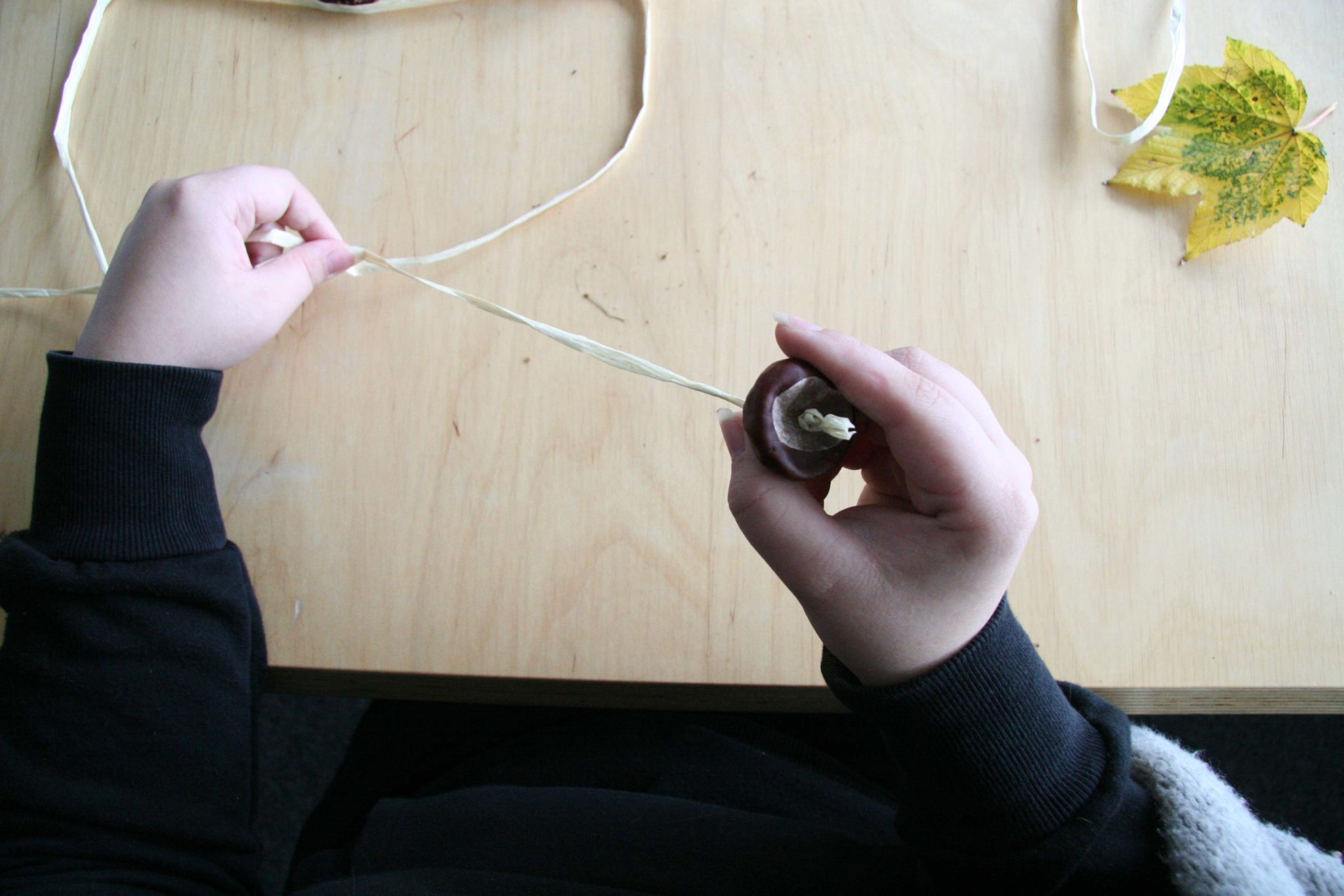 Nun kannst Du deiner Kreativität freien Lauf lassen und die bunten und herbstlichen Materialien auf die Schnur auffädeln. Vergesse dabei aber nicht zwischendurch Knoten zu machen, damit die Materialien einen gewissen Abstand voneinander haben. Die Länge kannst Du dabei selbst bestimmen, je nachdem wie viel Platz Du zur Verfügung hast.