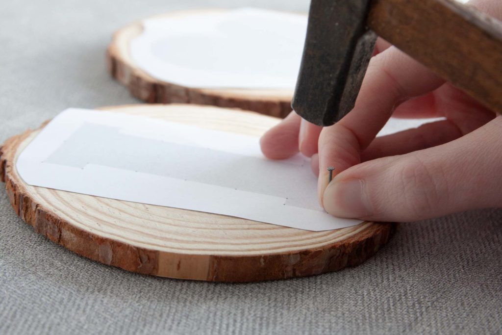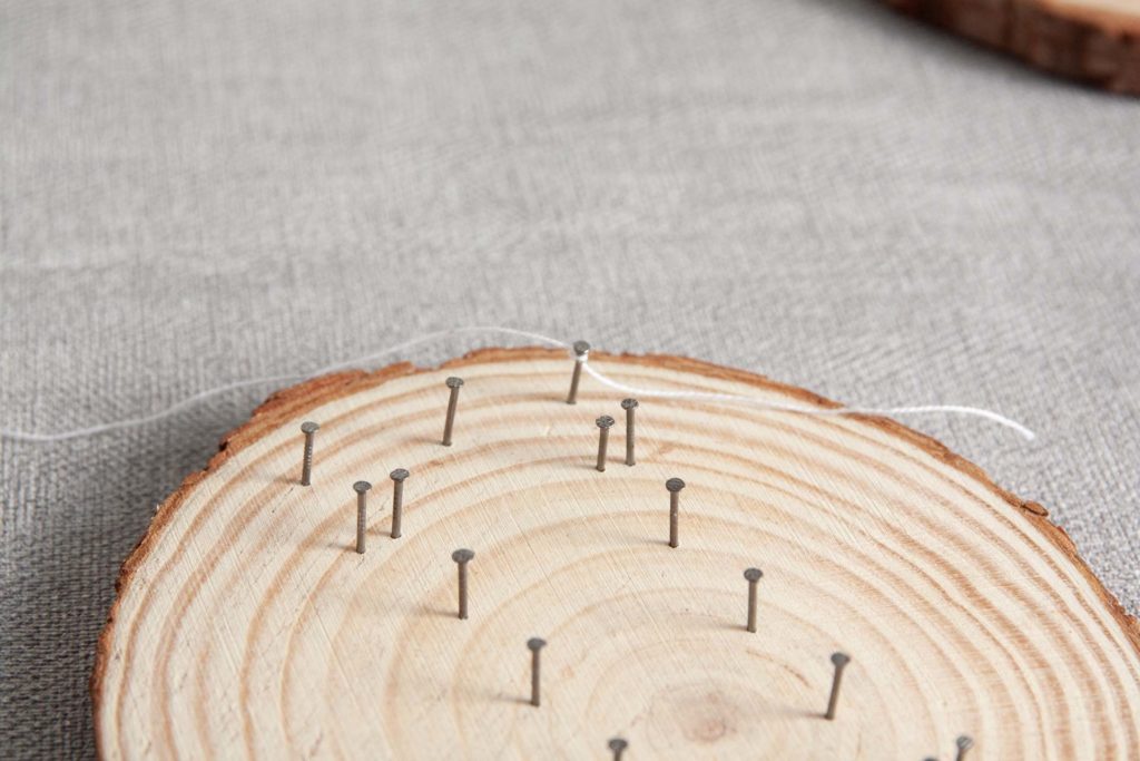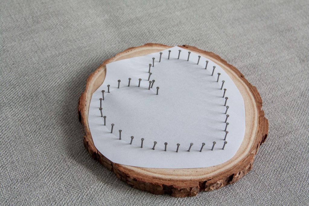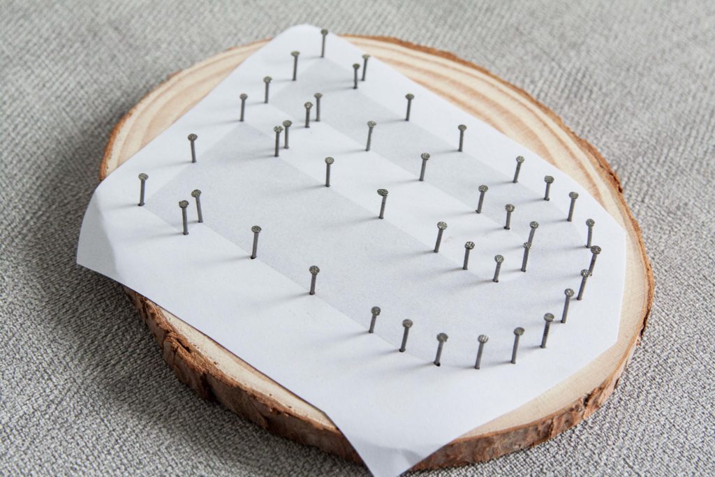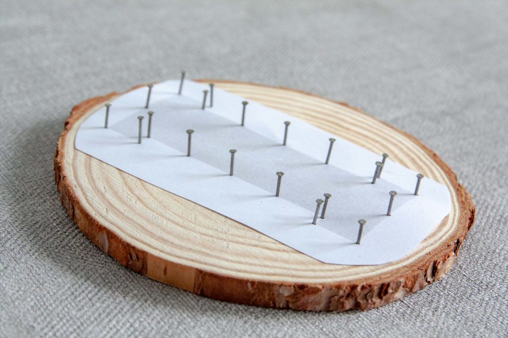 Danach legt ihr die ausgeschnittenen Vorlagen auf die Holzscheiben und fixiert die Nägel. Die Punkte dienen als Orientierung.