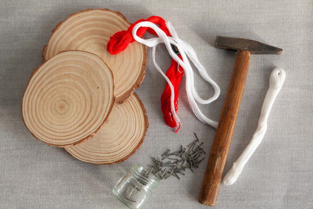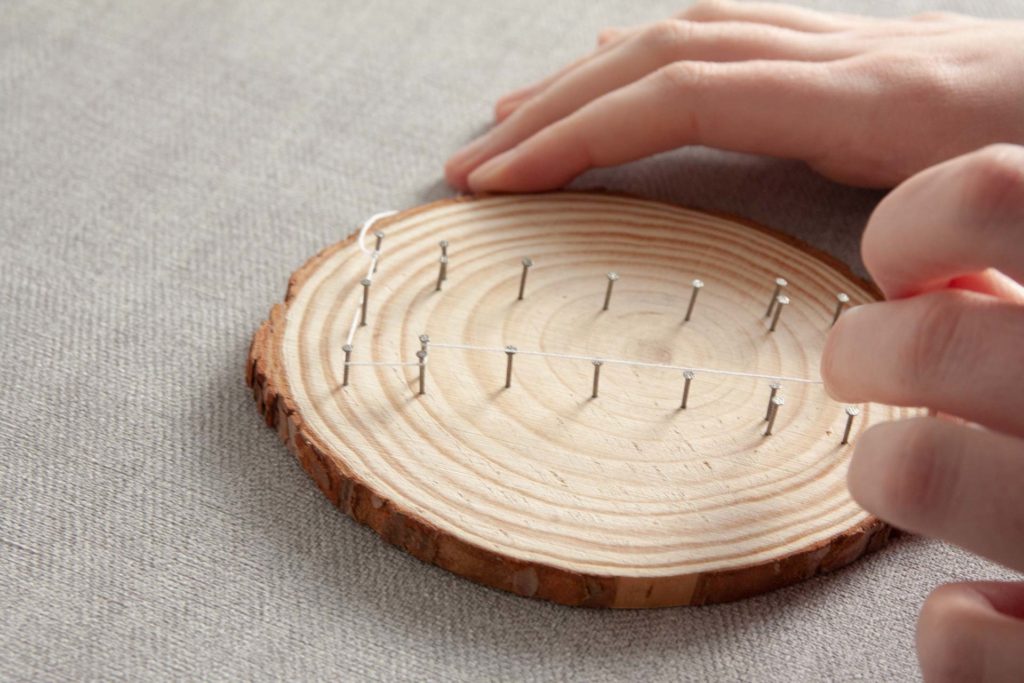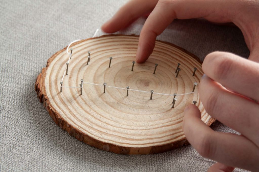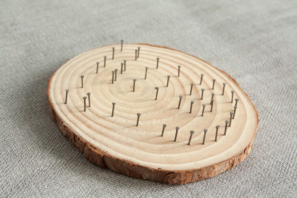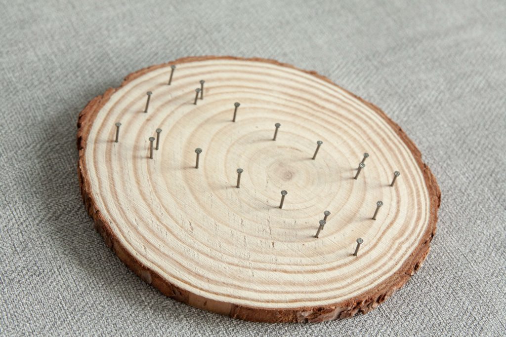 Danach legt ihr die ausgeschnittenen Vorlagen auf die Holzscheiben und fixiert die Nägel. Die Punkte dienen als Orientierung.