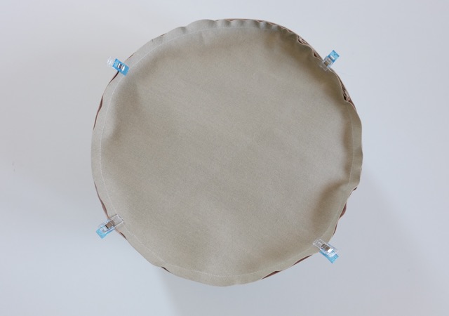 Markiert an dem Außenbeutel die 4 gegenüber liegenden Punkte mit Klammern oder Zwicken. Viertelt ebenso den Boden und steckt den Kreis rechts auf rechts auf den Ring auf. Die Zwicke treffen dabei aufeinander. Näht den Boden rundherum an.