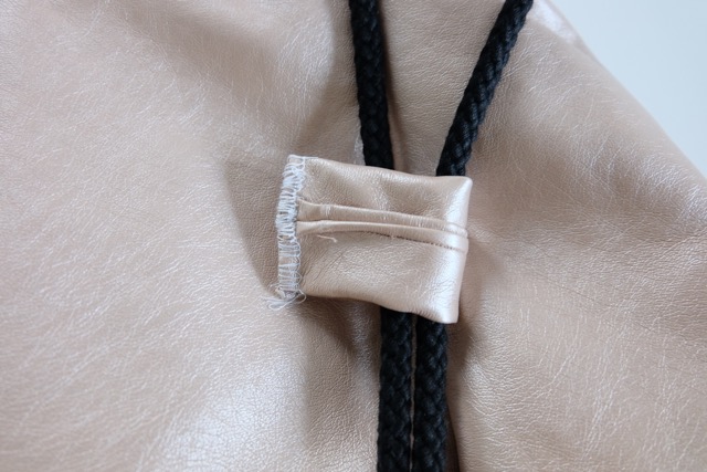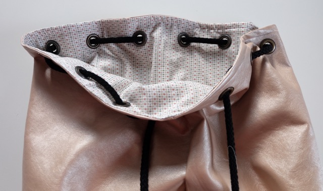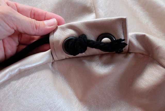 Fädelt nun die Kordel erst durch die oberen Ösen. Anfang und Ende an der Seitennaht.