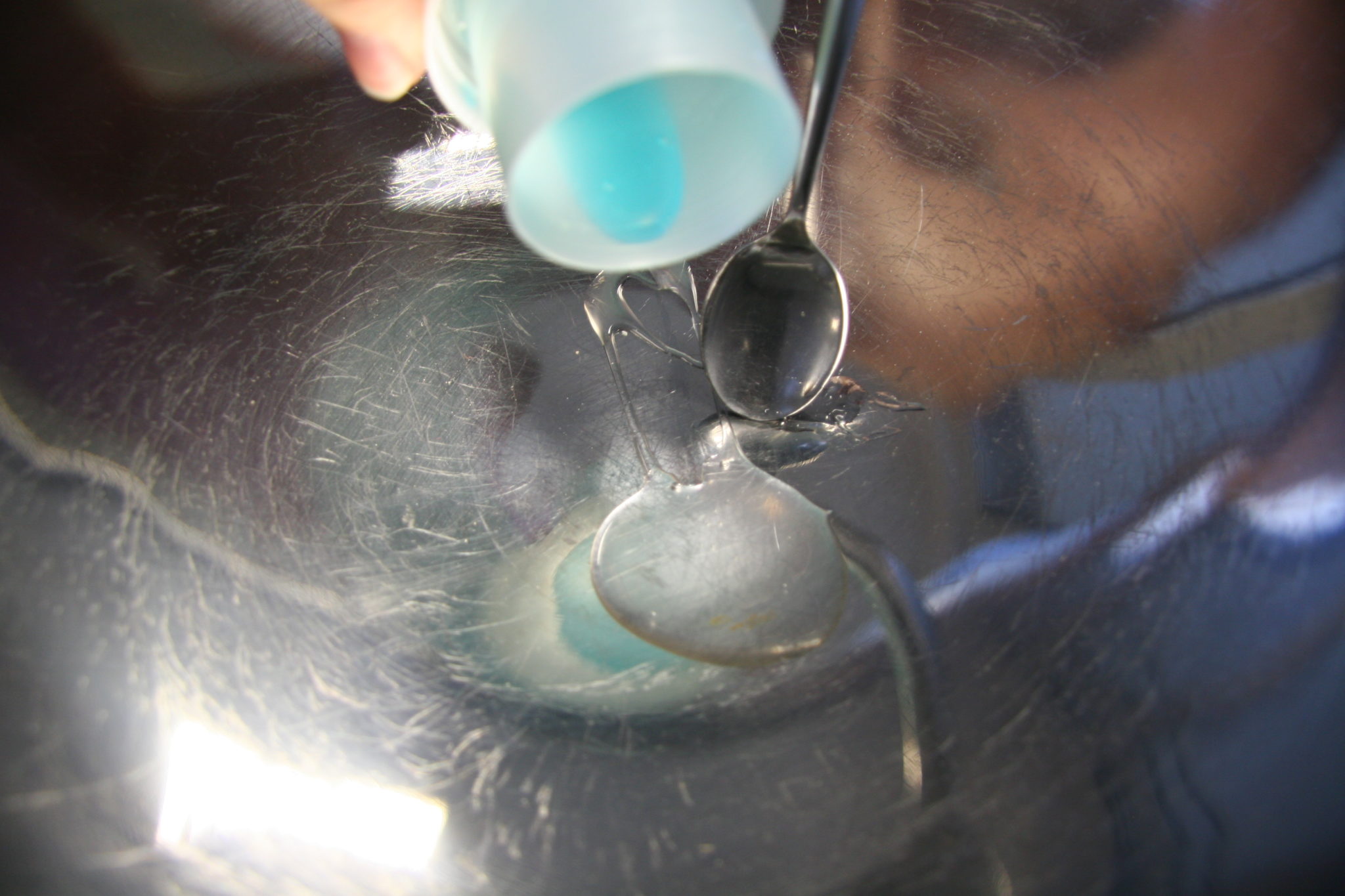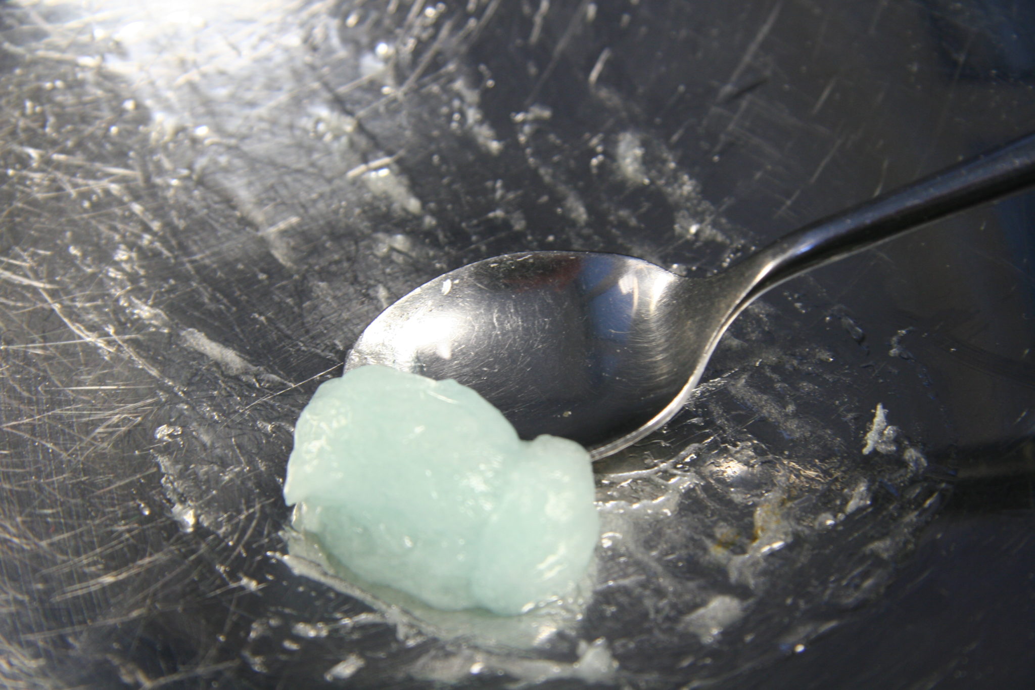 Zuerst gibst du einen Teelöffel des Klebers in eine Schüssel und gibst nach und nach einen viertel Teelöffel Waschmittel dazu. Kippe nicht das ganze Waschmittel auf einmal rein. Am besten immer nur einen Tropfen und gut vermischen, bevor du den nächsten Tropfen Waschmittel rein tust.