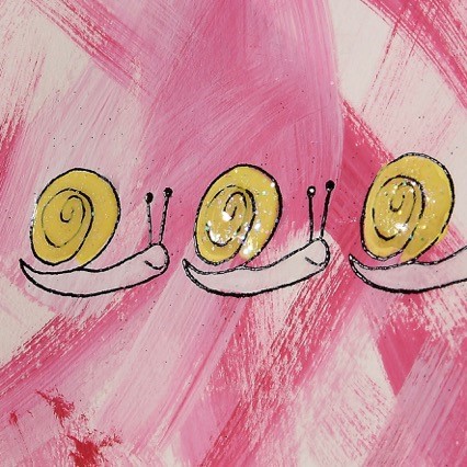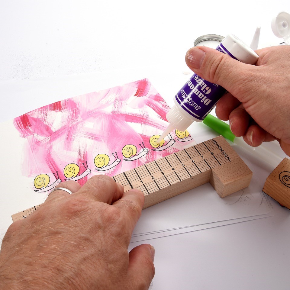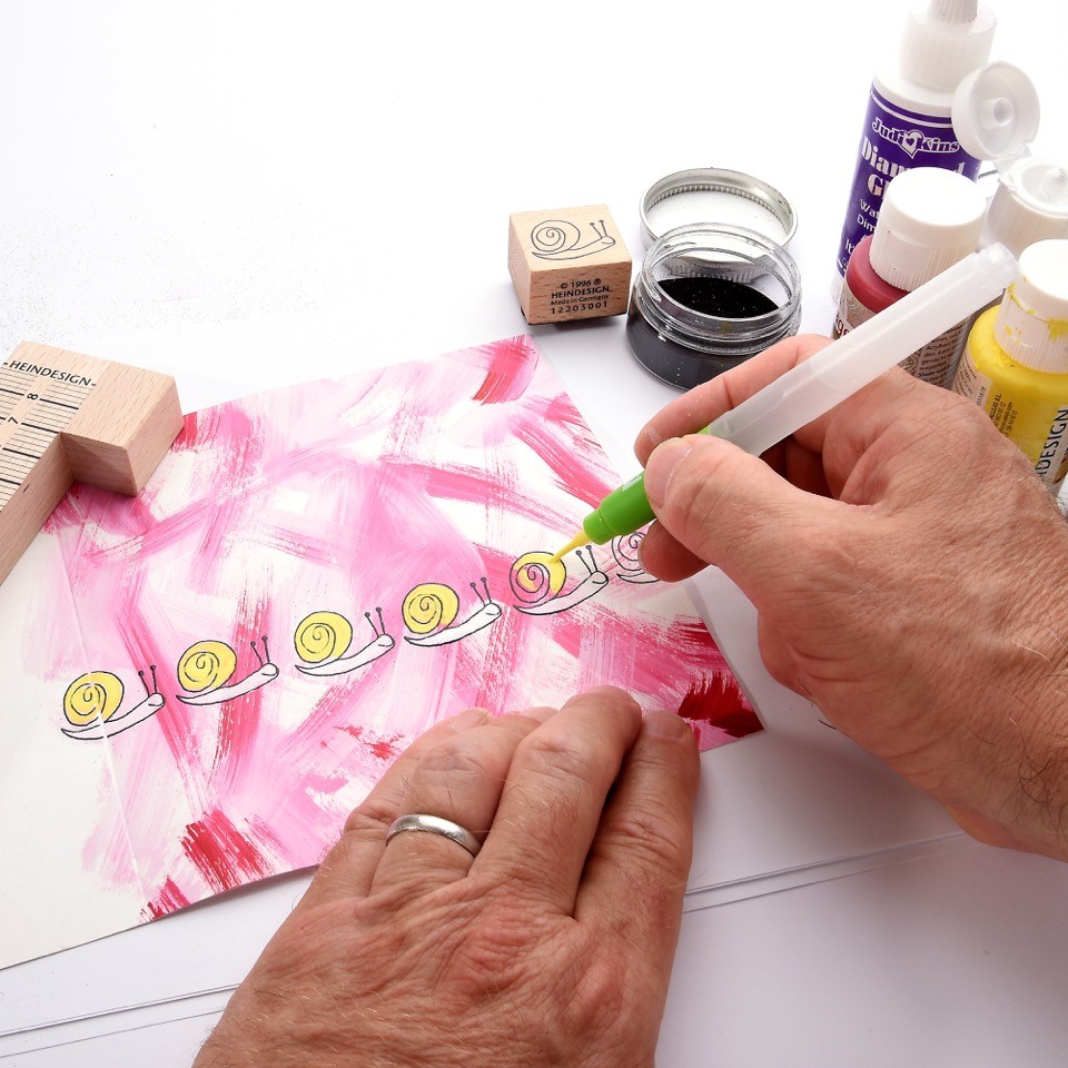 Anschließend werden die Schneckenmotive nachdem sie gut getrocknet sind, mit gelber und weißer Acrylfarbe ausgemalt. Im Anschluss gebt ihr auf die Schneckenhäuser einen kleinen Klecks Diamond Glaze und streut den Sternenglanz drüber.