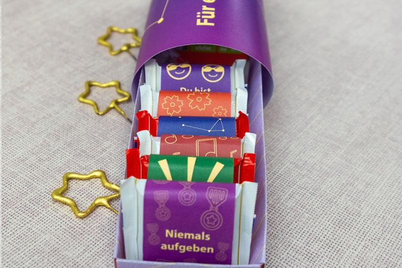 Das Tolle an unseren Ritter Sport Banderolen? Ihr braucht keine umfangreichen Bastelkenntnisse! Alles, was ihr tun müsst, ist die Banderolen herunterzuladen, auszudrucken und um eure Ritter Sport Minis zu kleben. Die perfekte DIY Schokoriegel Verpackung für jeden, der etwas Einzigartiges schaffen möchte, ohne viel Zeit zu investieren.