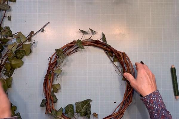 Jetzt steckst du das Ende einer Ranke zwischen die Weinruten und wickelst du diese um den Kranz. Das andere Ende befestigst du ebenfalls zwischen den Weinruten, so dass sie sich nicht mehr lösen kann. Das machst du mit einigen Efeuranken, bis der Kranz nach deinen Vorstellungen umwickelt ist.