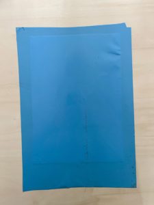 Nimm die Klebefolie und stelle sicher, dass sie groß genug ist, um die gesamte Vorlage zu bedecken. Lege die Vorlage auf die Klebefolie und achte darauf, dass sie gerade ausgerichtet ist. Drücke die Vorlage fest auf die Klebefolie, damit sie gut haftet. Spartipp: Um sparsam mit dem Material umzugehen und auch hier nachhaltig zu sein und nicht unnötig Müll zu produzieren, achte darauf, dass du die Klebefolie – nicht wie auf dem Bild gezeigt – mittig auf die Vorlage platzierst, sondern Platz sparend aufklebst.
