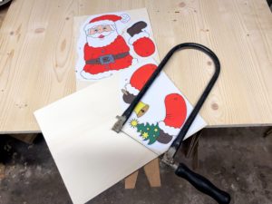 Bevor du jetzt mit dem Sägen beginnst musst du das Sägebrett anbringen. Achte darauf, dass das Sägebrett stabil und sicher befestigt ist. Verwende eine Laubsäge mit einem feinen Sägeblatt, um entlang der Konturen der Vorlage zu sägen. Folge den Linien sorgfältig und arbeite dich langsam voran, um saubere Schnitte zu erhalten.