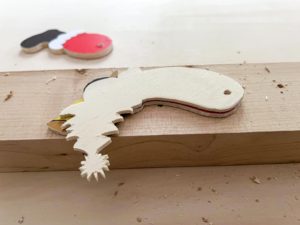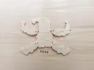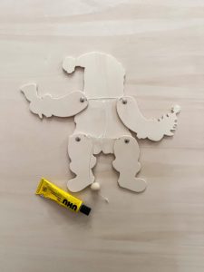 Schraube die Buchschrauben ein, um ein „Hampeln“ des Weihnachts-Hampelmannes zu ermöglichen. Zusätzlich empfehle ich, die Schraube in der Hülse der Buchschraube mit einem kleinen Klecks Kleber zu befestigen, um sicherzustellen, dass die Kleinteile später nicht herausfallen und versehentlich verschluckt werden können. Fädele nun die Schnur durch die kleineren Löcher und verknote sie. Anschließend ziehst du die Buchschrauben fest, um die Verbindung zu sichern.