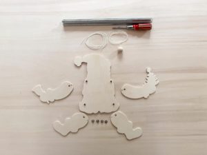 Nachdem alle Einzelteile für den Hampelmann hergestellt wurden, ist es an der Zeit, mit dem Zusammenbau zu beginnen. Die beweglichen Teile müssen miteinander verbunden werden, und dafür werden die Buchschrauben verwendet.