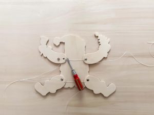 Fädele nun die Schnur durch die kleineren Löcher und verknote sie. Dies machst du sowohl bei den Armen als auch bei den Beinen. Anschließend ziehst du die Buchschrauben fest, um die Verbindung zu sichern.