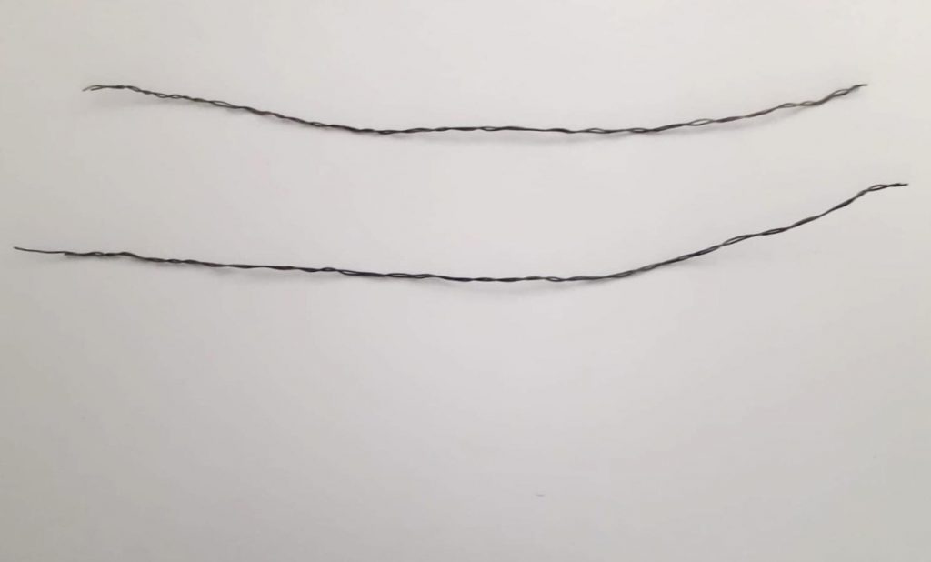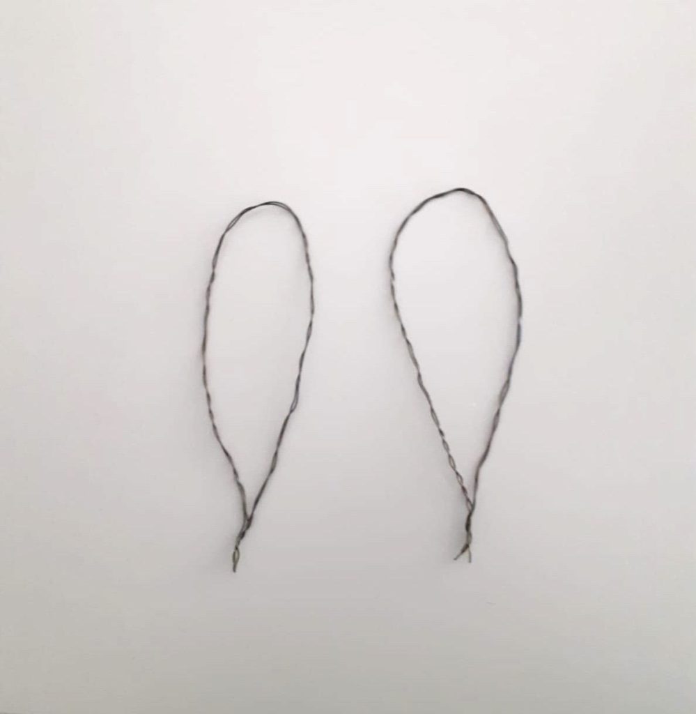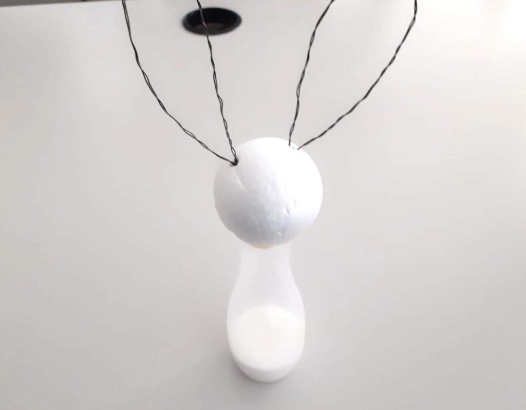 Nun machst du die Hasen-Ohren. Dazu nimmst du je zwei Drähte und verzwirbelst diese, damit der Draht stabiler wird. Dann biegst du die Drähte zu zwei Ohren und verzwirbelst die Enden miteinander. Dann werden die Ohren links und rechts in die Styroporkugel eingesteckt.