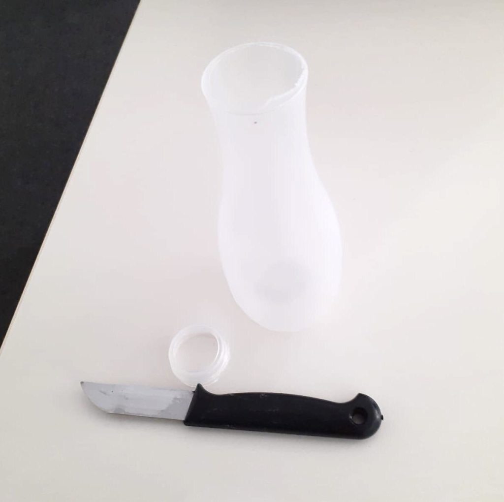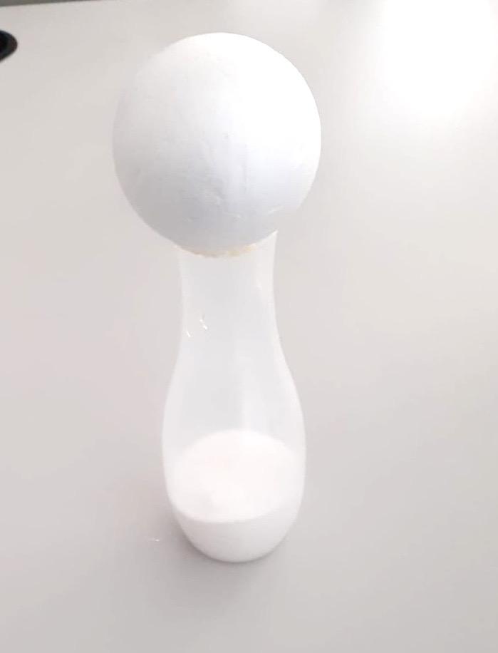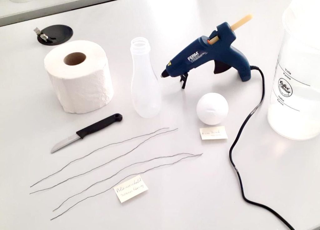 Als erstes schneidest du den oberen Teil vom Flaschenhals mit dem Küchenmesser ab. Dann füllst etwas Sand in die Flasche. Wenn du keinen Sand hast, kannst du auch Reis, Linsen, Erbsen oder Blumenerde nehmen. Hauptsache die Flasche bekommt so mehr Standfestigkeit. Dann befestigst du die Styroporkugel mit Heißkleber
